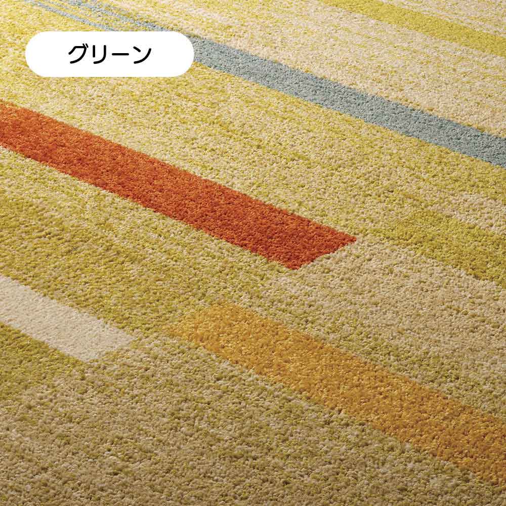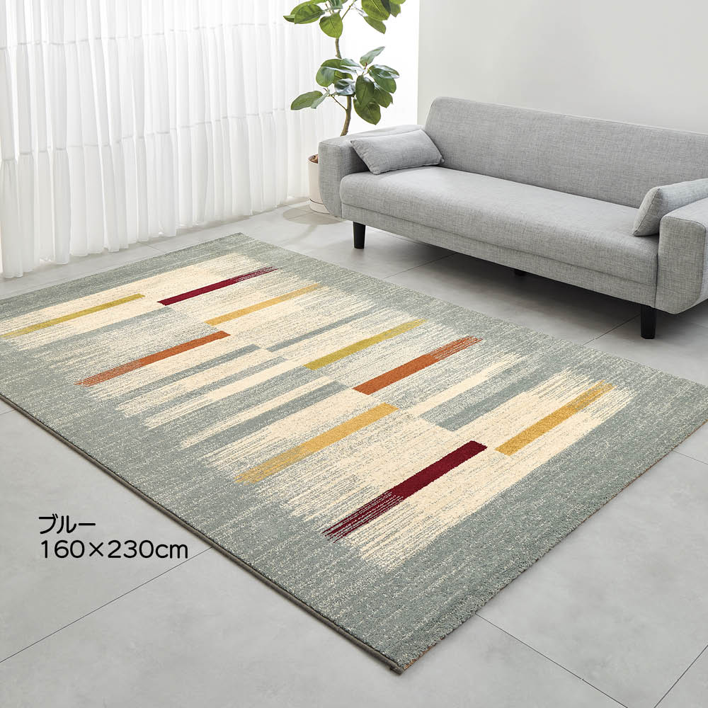 落ち着いたブルーとグリーンの地色に、細やかな多色ラインが溶け込み、シンプルな部屋にも上品なアクセントをプラス。派手すぎない絶妙なコントラストが、上質でありながらカジュアルな雰囲気を併せ持ち、大人の空間をセンス良く演出します。(写真は(ア)グリーン 160×230cm)