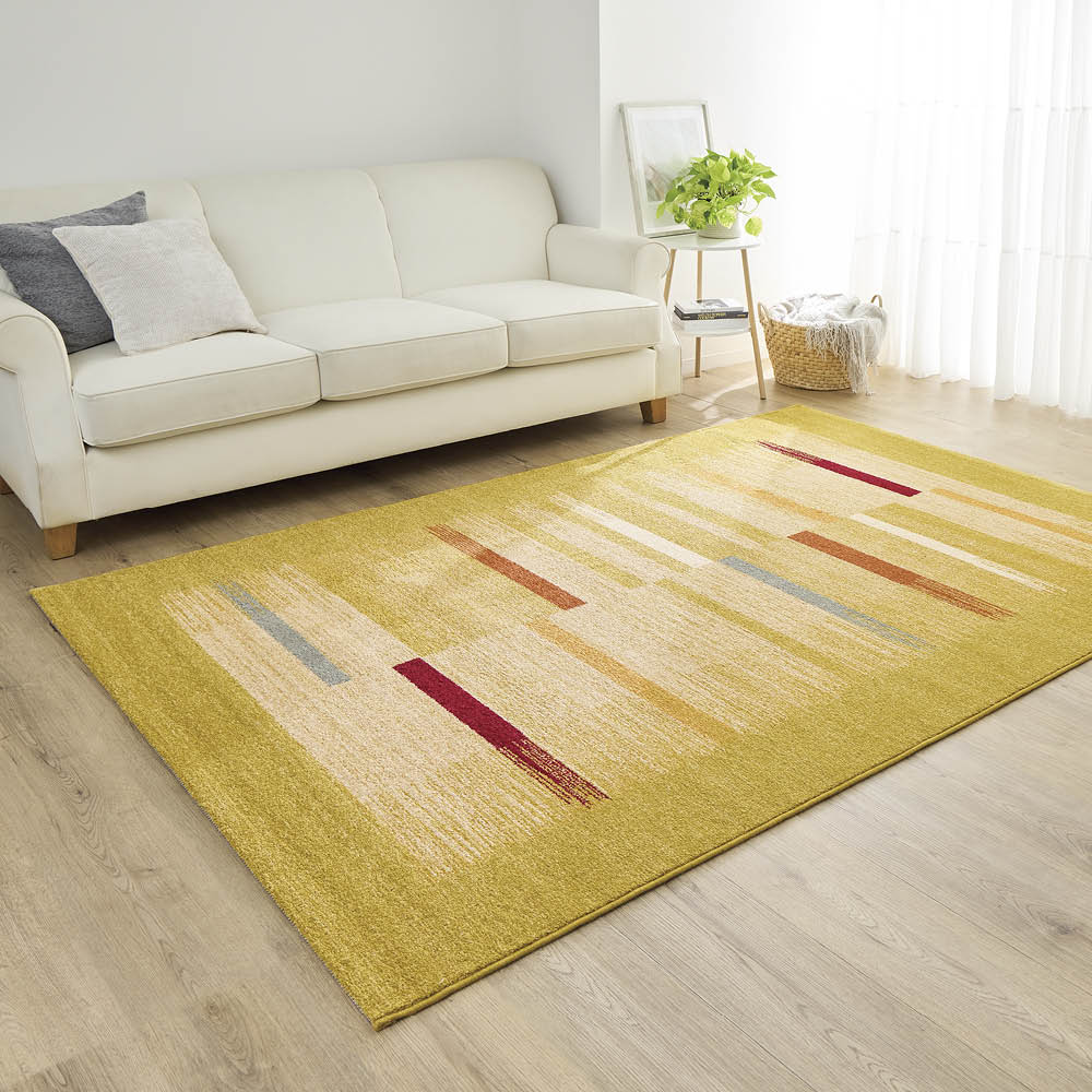 毛足約9mmのほどよい厚みと、ウィルトン織が生み出すしっとりとした踏み心地。贅沢な織りがアートのようなデザインと響き合い、空間をおしゃれに彩ります。