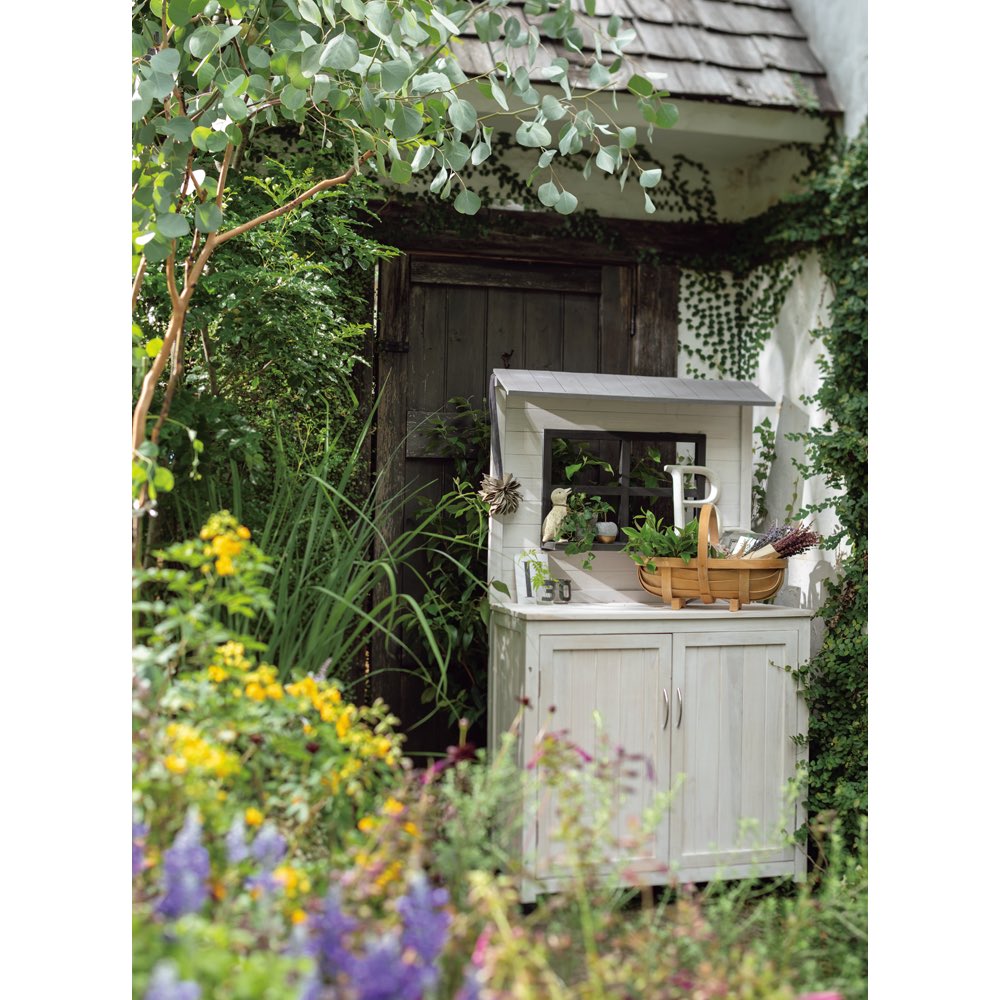 置くだけで雰囲気たっぷりの存在感を醸し出す多目的収納庫。天板は植え替えなど作業台として重宝。木の素材感を活かした塗装です。
