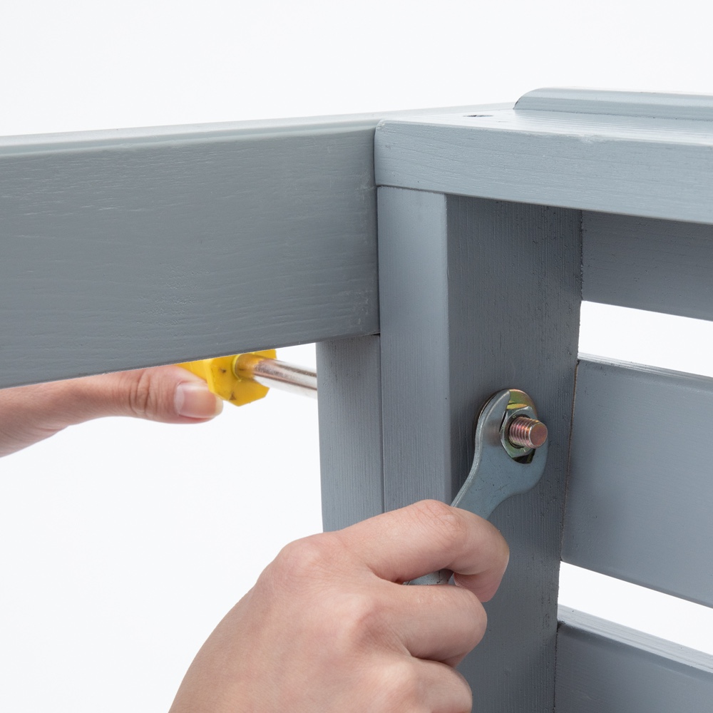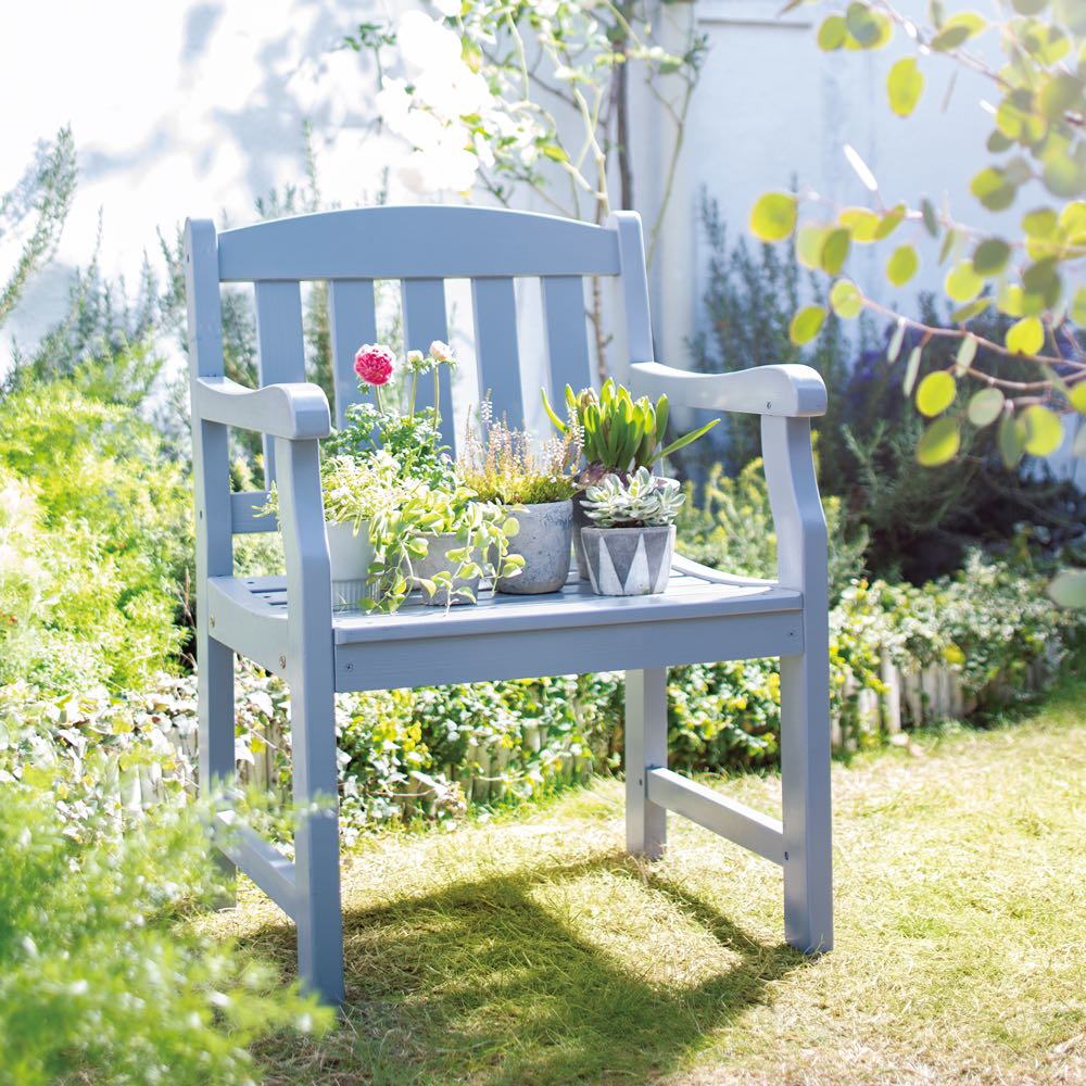 狭いお庭でも置きやすいのに、ゆったり座れるサイズ感。置くだけでストーリーが生まれ印象的なお庭になります。座面はすのこ状なので花台としても。