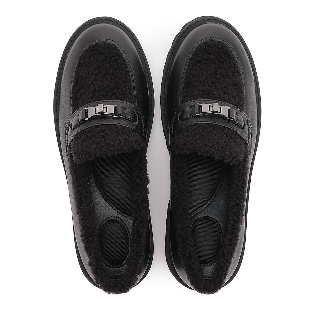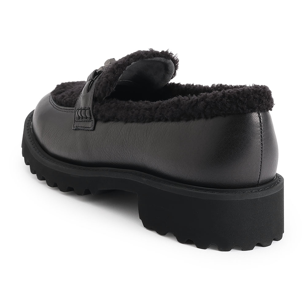 マニッシュなローファーにカジュアル&フェミニンなディテールをプラス。ブラックのスムースレザーに合わせて、ふわふわのボアや優美な光沢の金具パーツをワントーンで仕上げてリッチ感のある印象に。商品画像の説明