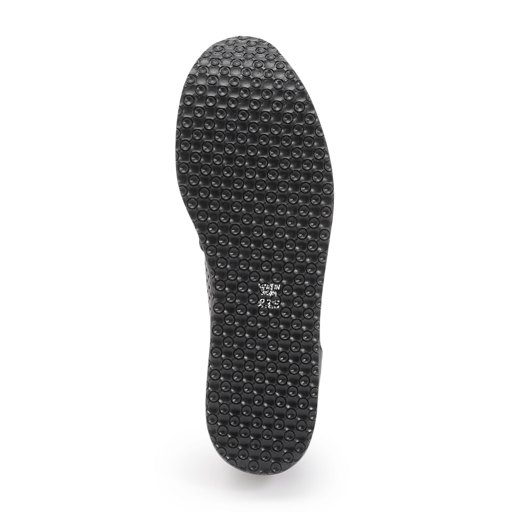 リラクシーなワイズを感じさせないスマートなシルエットのレザースリッポン。繊細なパンチングレザーとスムースレザーのコントラスト、大ぶりのチェーンビットがスタイリッシュカジュアルな佇まいに。商品画像の説明