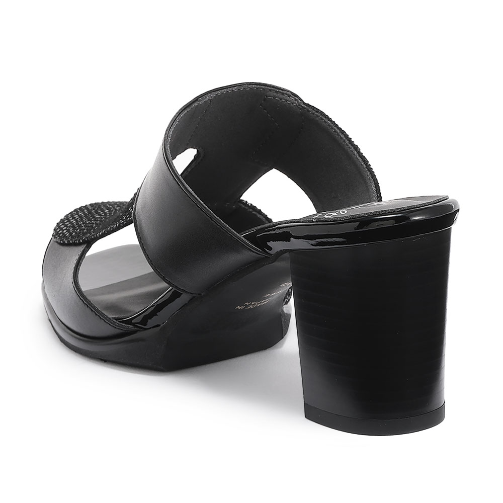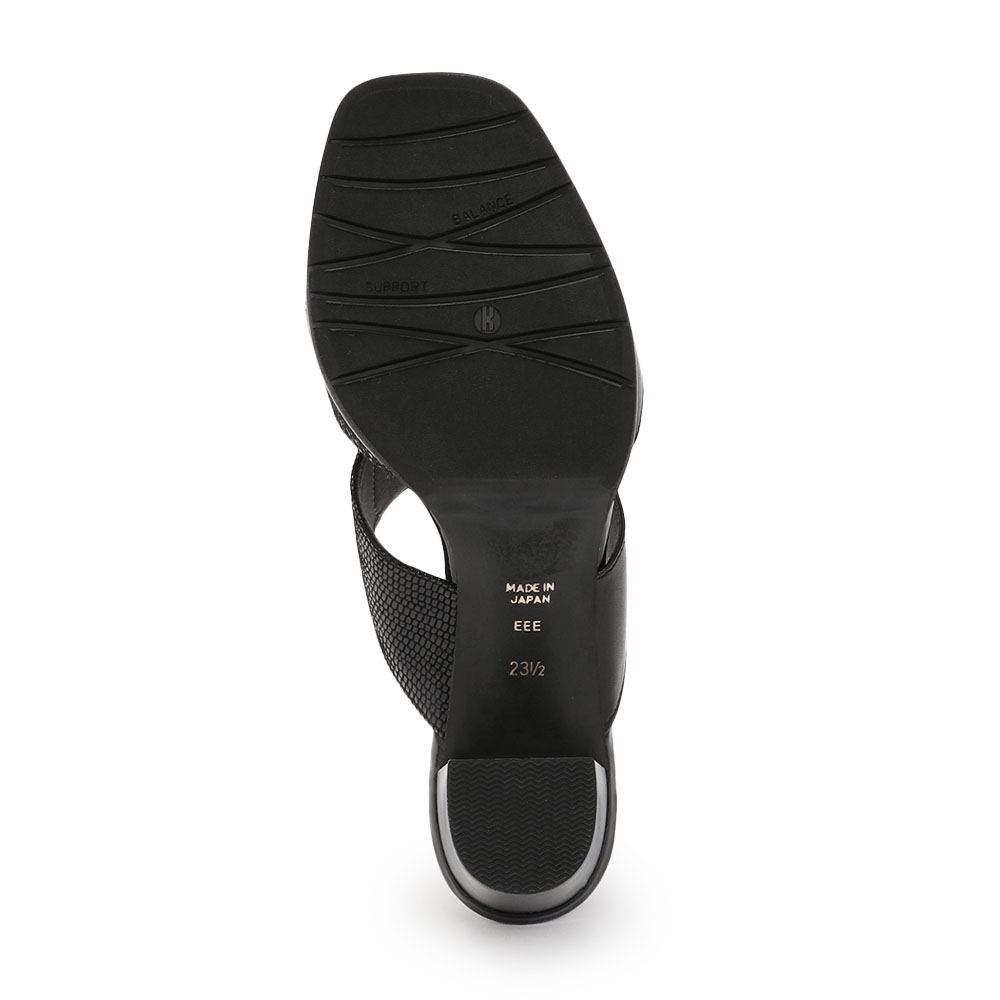 アシンメトリーで抜け感のあるデザインと異素材ミックスがつくる、モードな一足。程よい厚みのソールで歩きやすさにこだわり、インナーにはすべりにくい人工スエードを使用。靴底は接地面を広く取って安定感を高め、ヒールの高さは約7.5cmながら太めのデザインでぐらつきにくい仕様に。