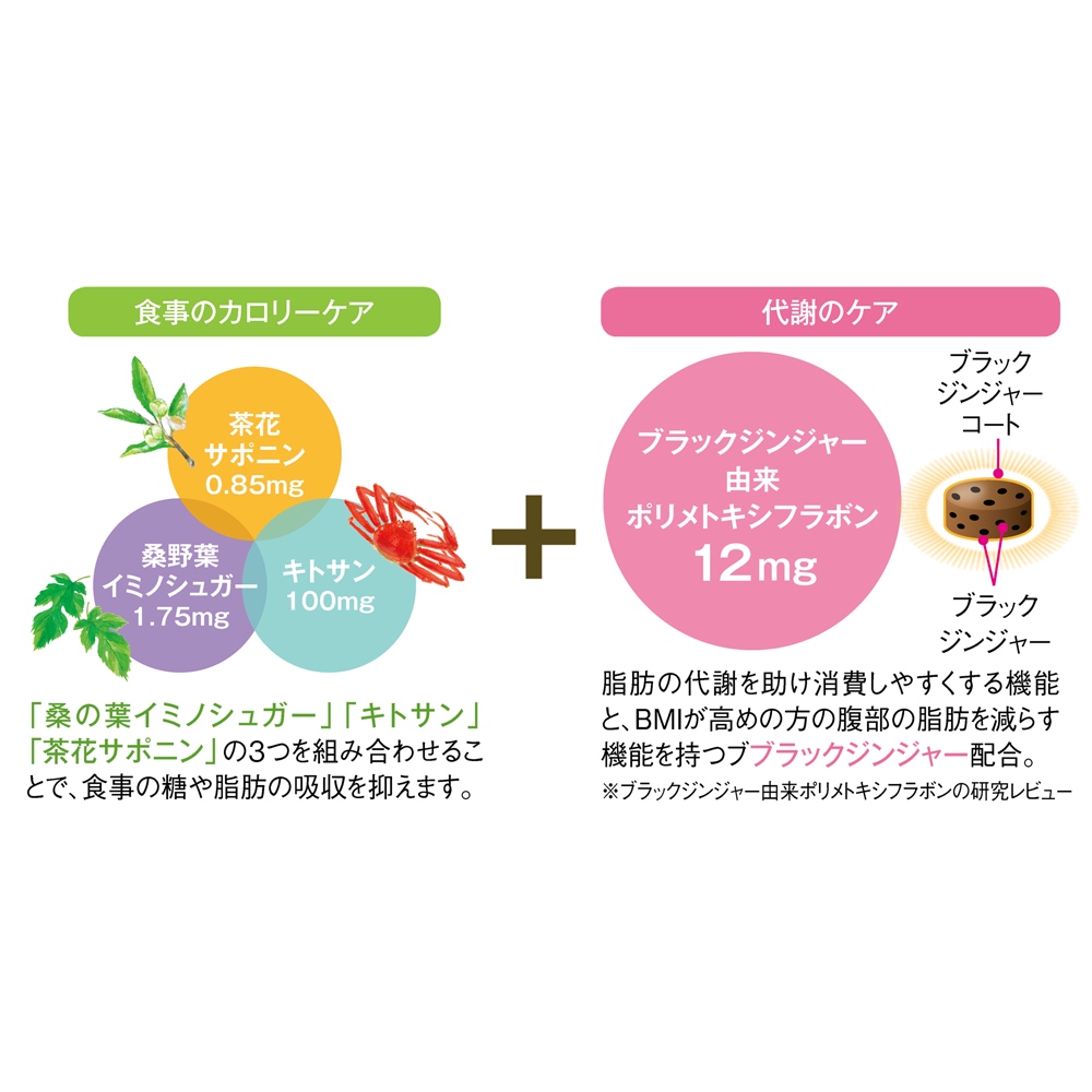 【機能性関与成分】桑の葉イミノシュガー、キトサン、茶花サポニン、ブラックジンジャー由来ポリメトキシフラボン