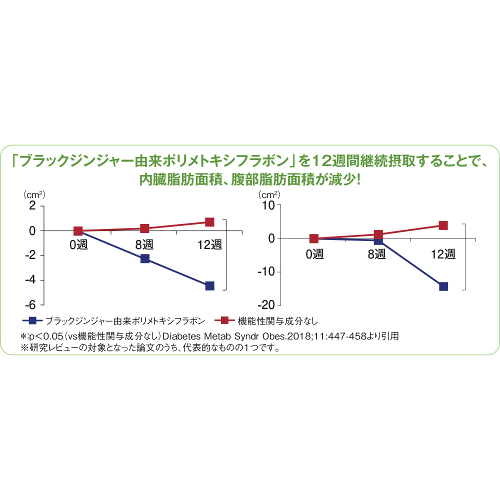 腸内環境を良好にし、体重・体脂肪を減らす2種のビフィズス菌とN-アセチルグルコサミンを配合。脂肪を消費しやすくするブラックジンジャー(ポリメトキシフラボン)をさらに配合することで、おなかの脂肪(内臓脂肪・腹部総脂肪)を減らします。
