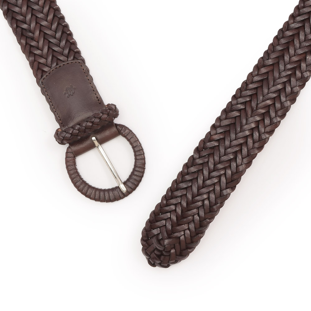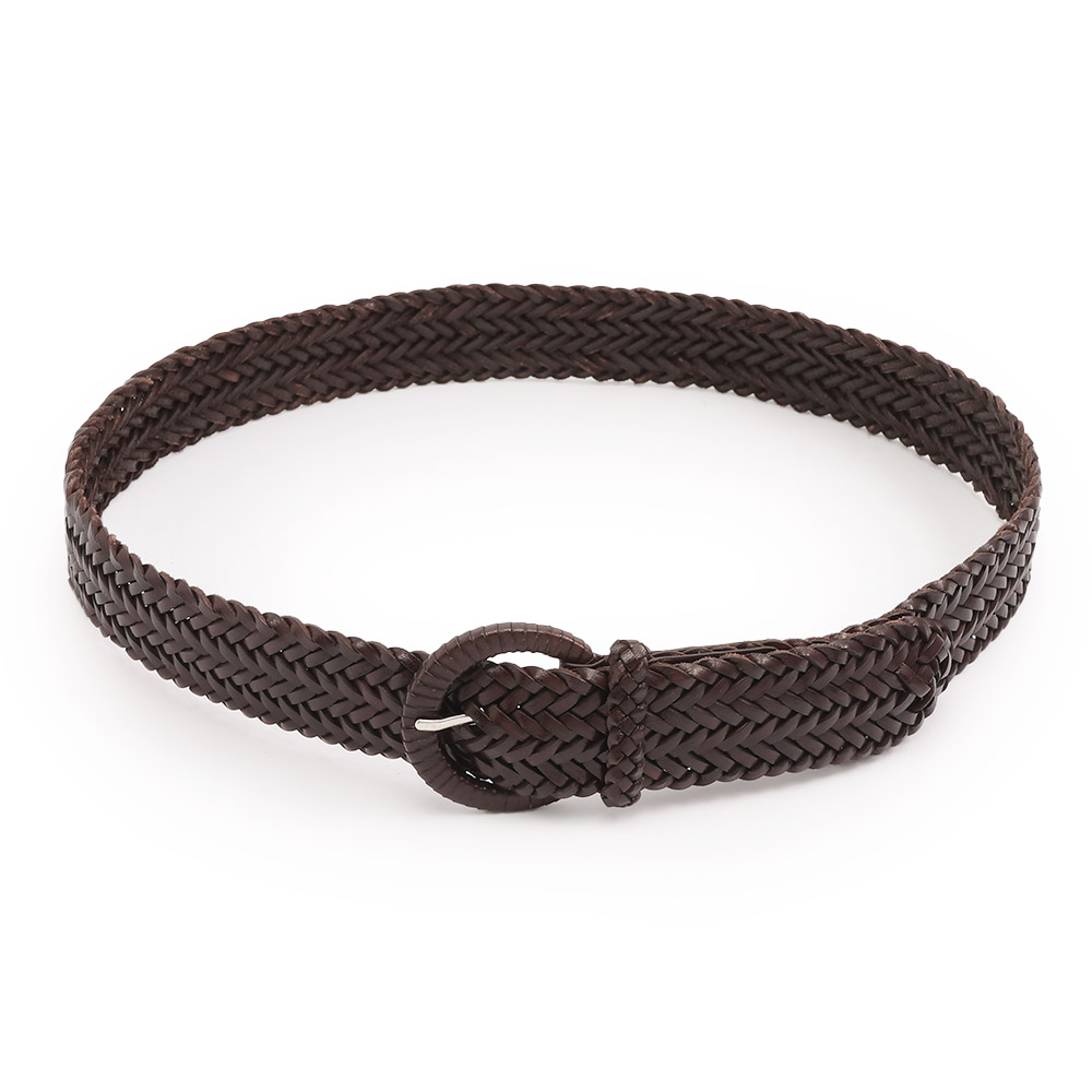 ピュアベジタブルタンニングにした上質革のレザーメッシュを得意とするベルギー発「dragon」。職人による緻密な手編みや、ベルト本体に合わせ、バックルも丹念に革巻き仕上げに。丈夫で軽い革は、経年変化も楽しみ。商品画像の説明。