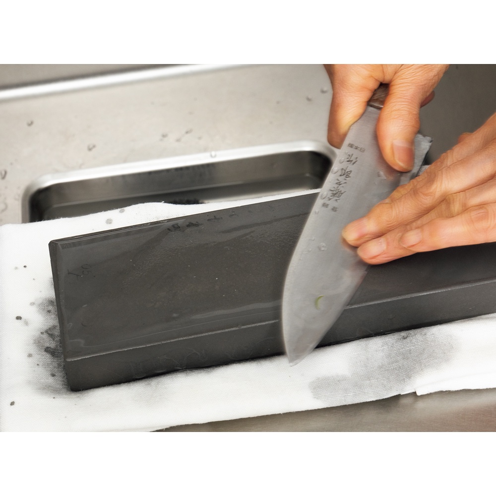 一般の人造砥石のように研ぐ前に長時間水に浸しておく必要はなく、手のひら一杯の水をかけるだけですぐ研ぎ始めることが可能。