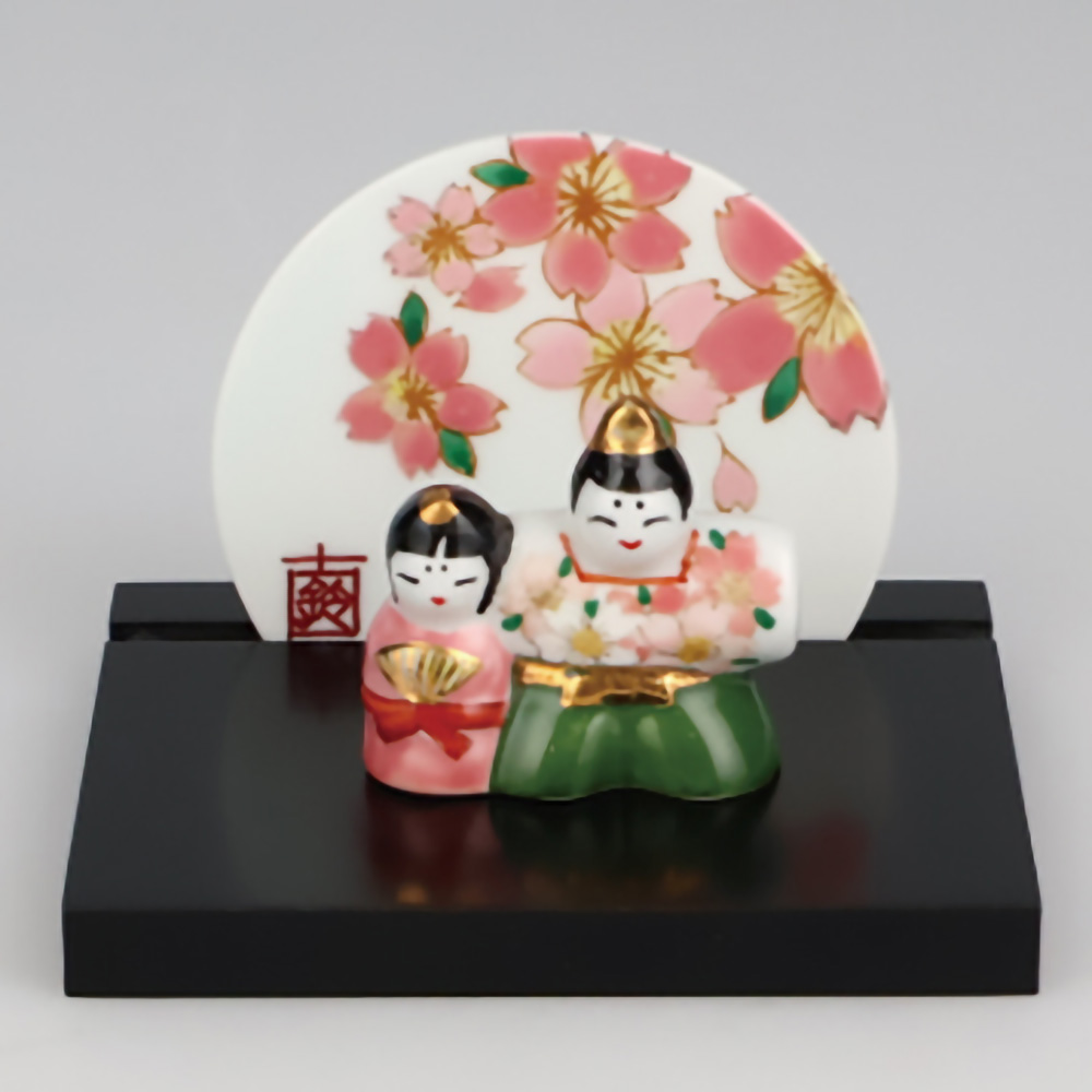お雛様は桜、兜飾りは花菖蒲の絵の陶板を、背景として組み合わせた季節感あふれるデザイン。