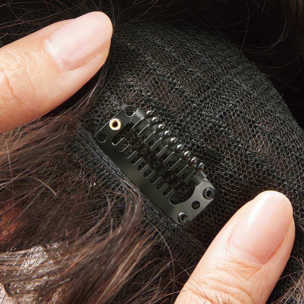 • 前髪の生え際部分をピンで留めて簡単固定。アジャスターでサイズ調整も。