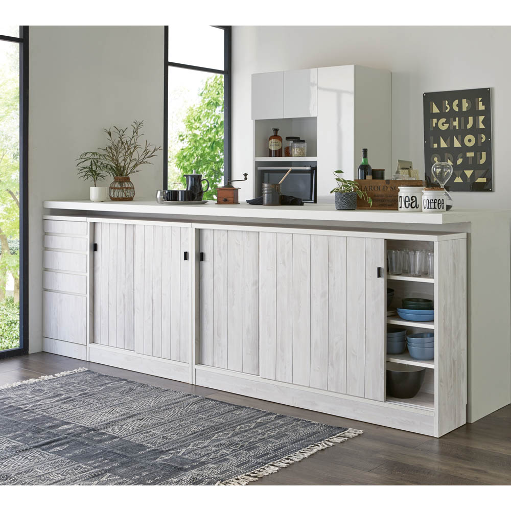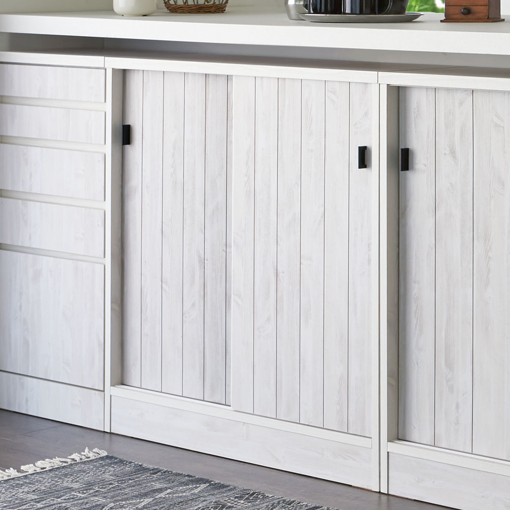 ヴィンテージ風の白い木目がおしゃれな、引き戸式のカウンター下収納棚です。