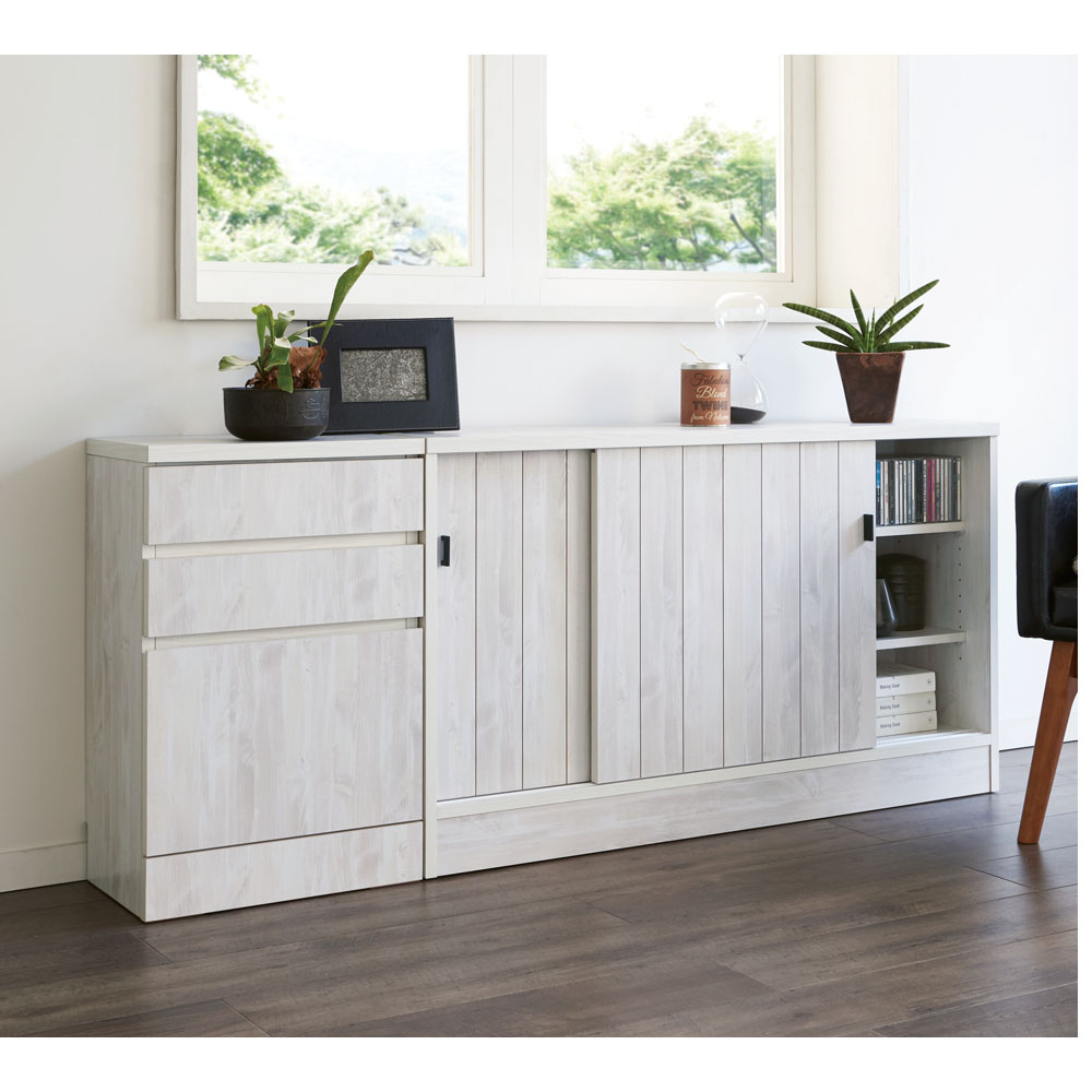 ヴィンテージ風の白い木目がおしゃれな、引き戸式のカウンター下収納棚です。※お届けは収納庫・幅120cm高さ70cmです。