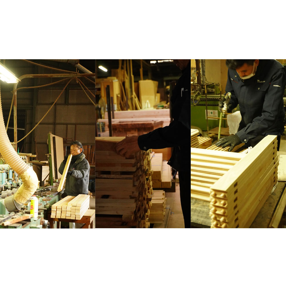 本シリーズは家具の名産地である福岡県大川市の家具工場にて製作されている国産品です。製材から塗装までの全工程を一つの工場で行うことで、コストを押さえながら高品質なものづくりを実現しています。