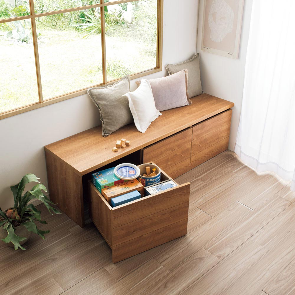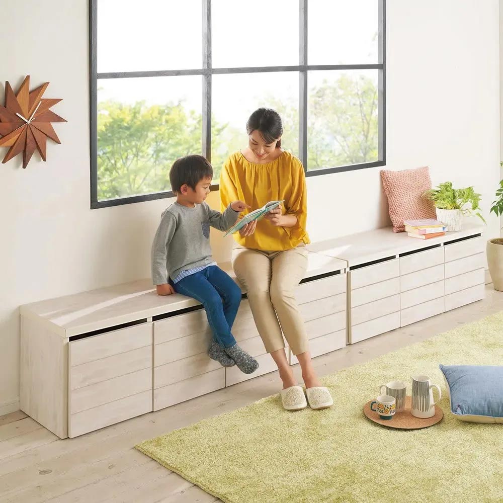 使用イメージ(イ)ホワイト(木目) 窓辺がくつろぎや読み聞かせのスペースに。 ※写真左から別売りの4連・幅159cm奥行40cm高さ44cmタイプ、3連・幅120cm奥行40cm高さ44cmタイプです。