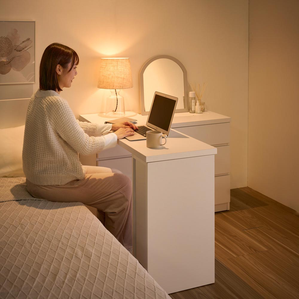 ●天板をL字に組めば、ベッドサイドなど限られた空間にも設置可能。