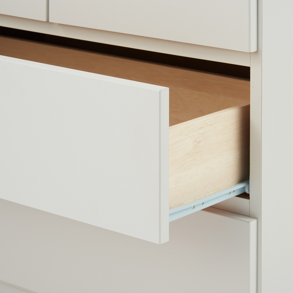 引き出しはスムーズに開閉できるスライドレール付き(小引き出しは除く)。内部底面は衣類に優しい化粧仕上げです。 ※引き出し内寸約:幅(小)43.5(大)90 奥行33 高さ(小)12.5(大)16