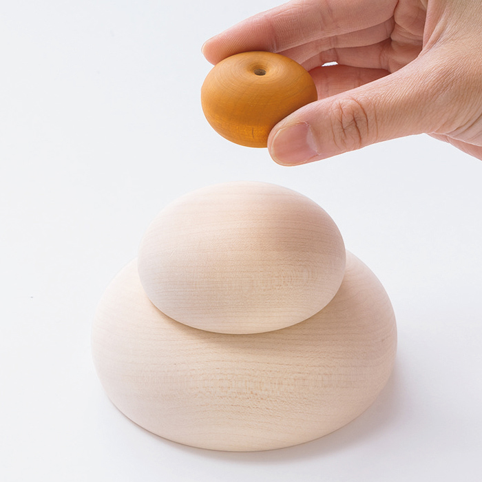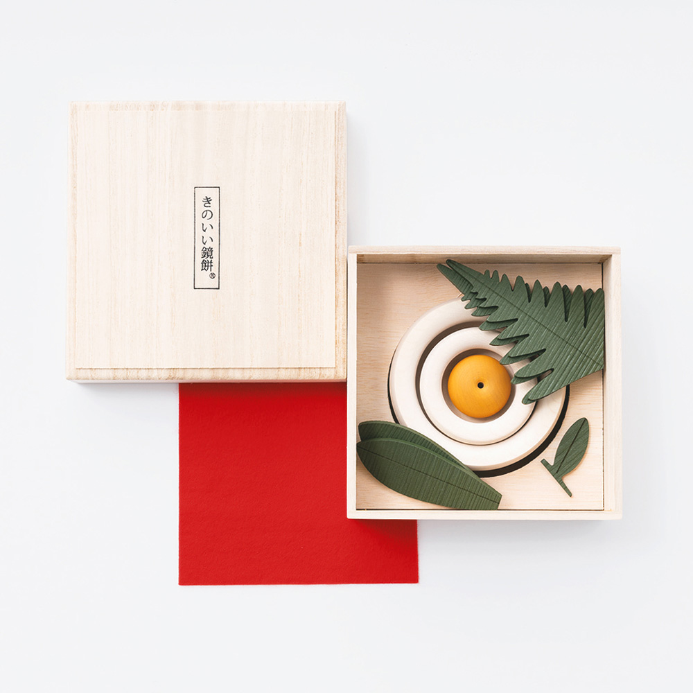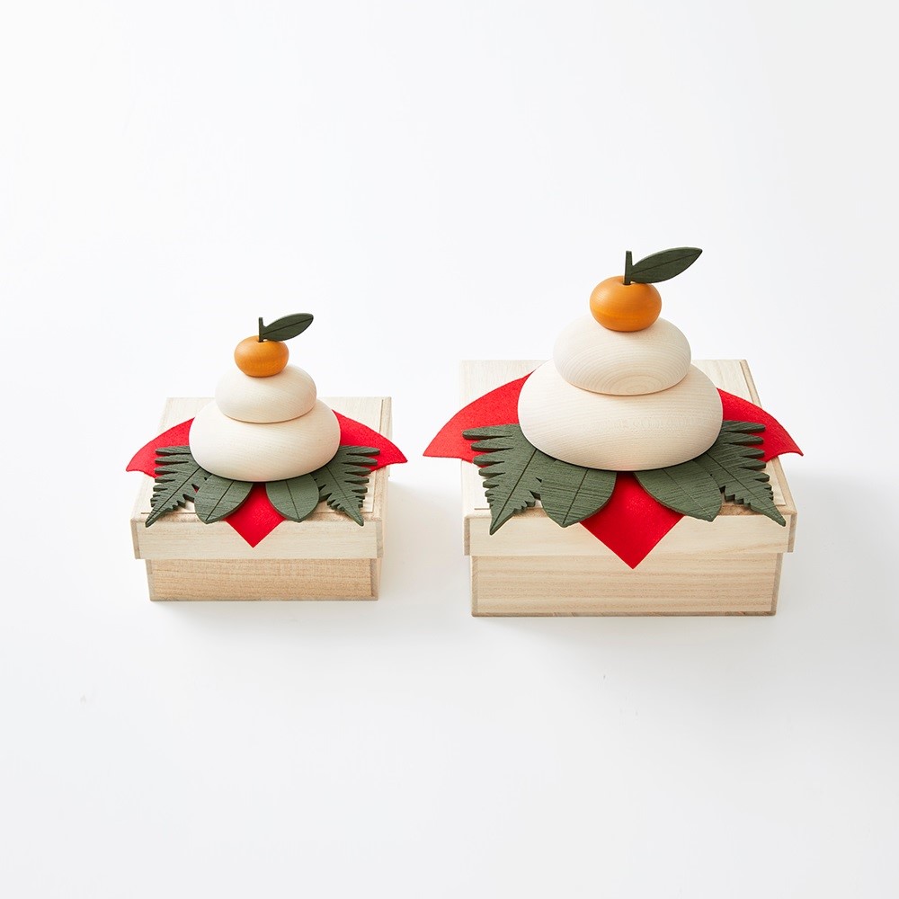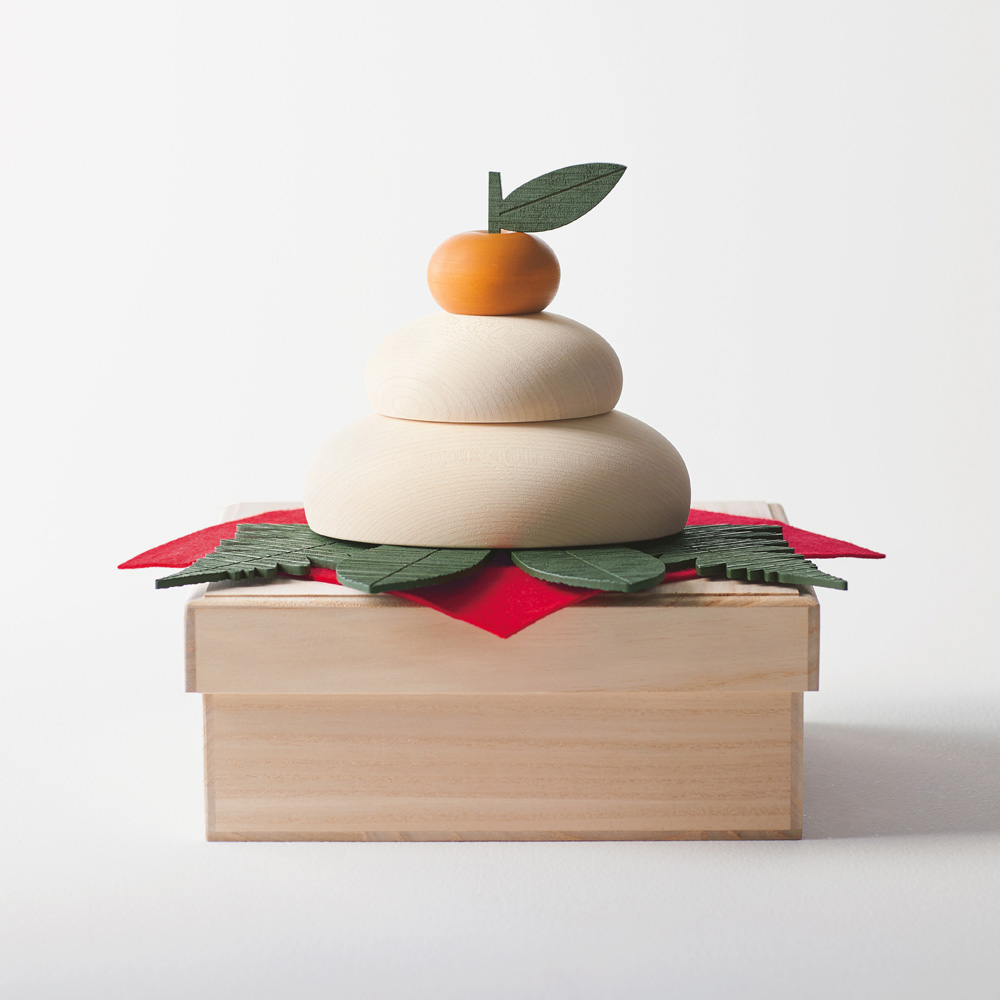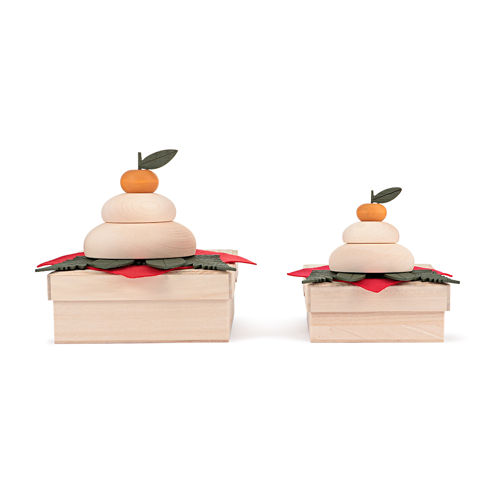 新年の幸福や健康を願う鏡餅。So Close,では餅、橙の実、葉のすべてにメープルの天然素材を使用した本格的なセットをご用意。大分県日田市の職人たちが手がけた、なめらかなカーブが魅力です。内側がくりぬかれた入れ子式で、飾り台を兼ねた桐箱に収納することができます。商品画像の説明