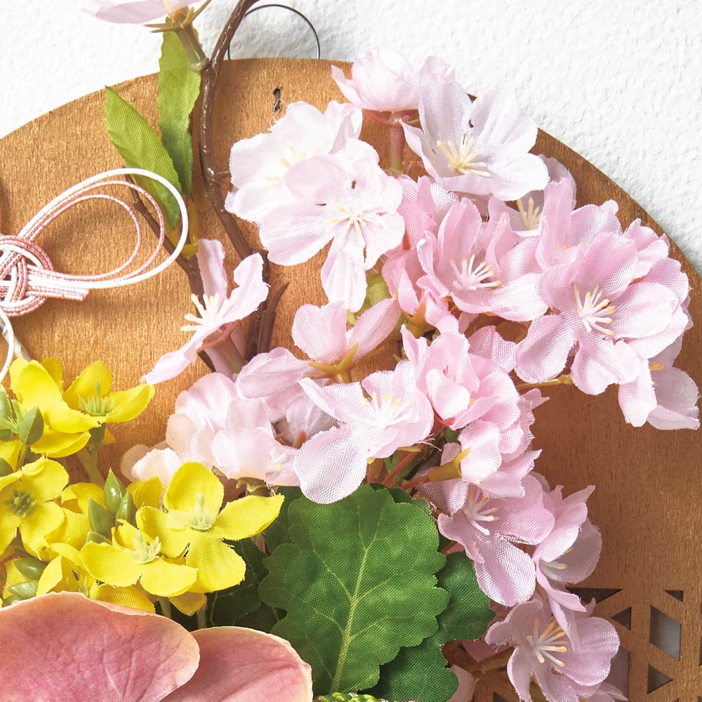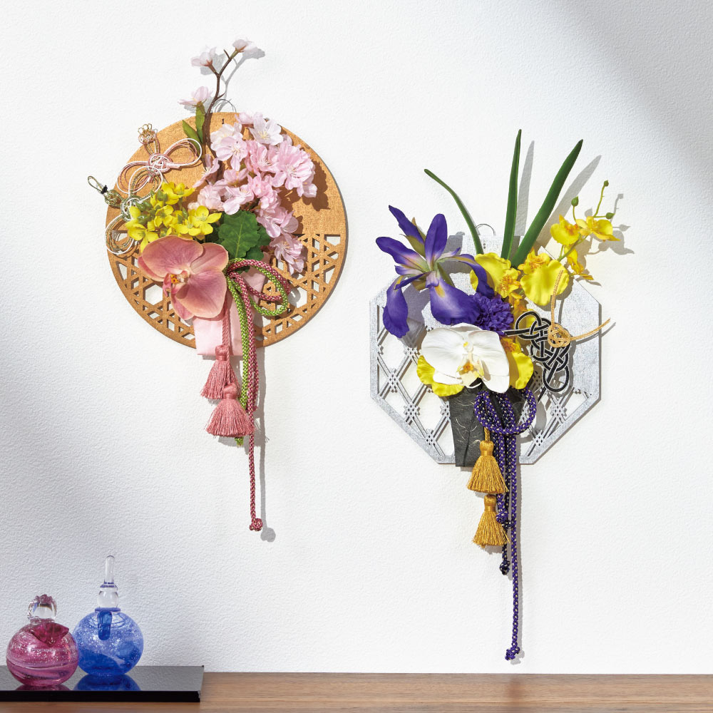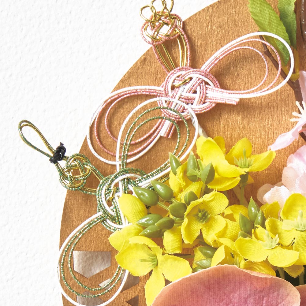 立体的でボリューム感もたっぷり。季節のアートフラワーに組み紐やタッセルなどをあしらいデザインした、壁掛けタイプのお花飾りです。