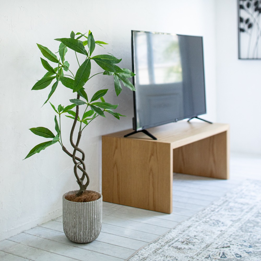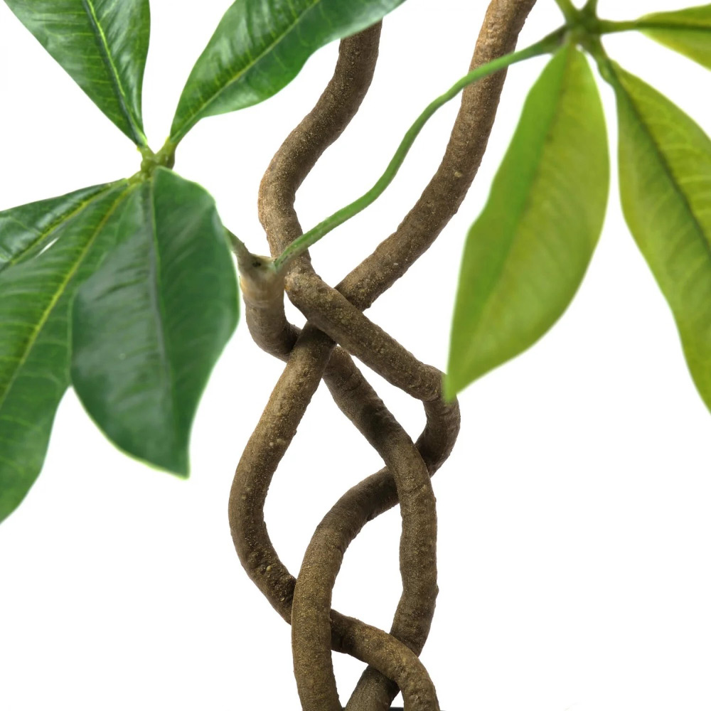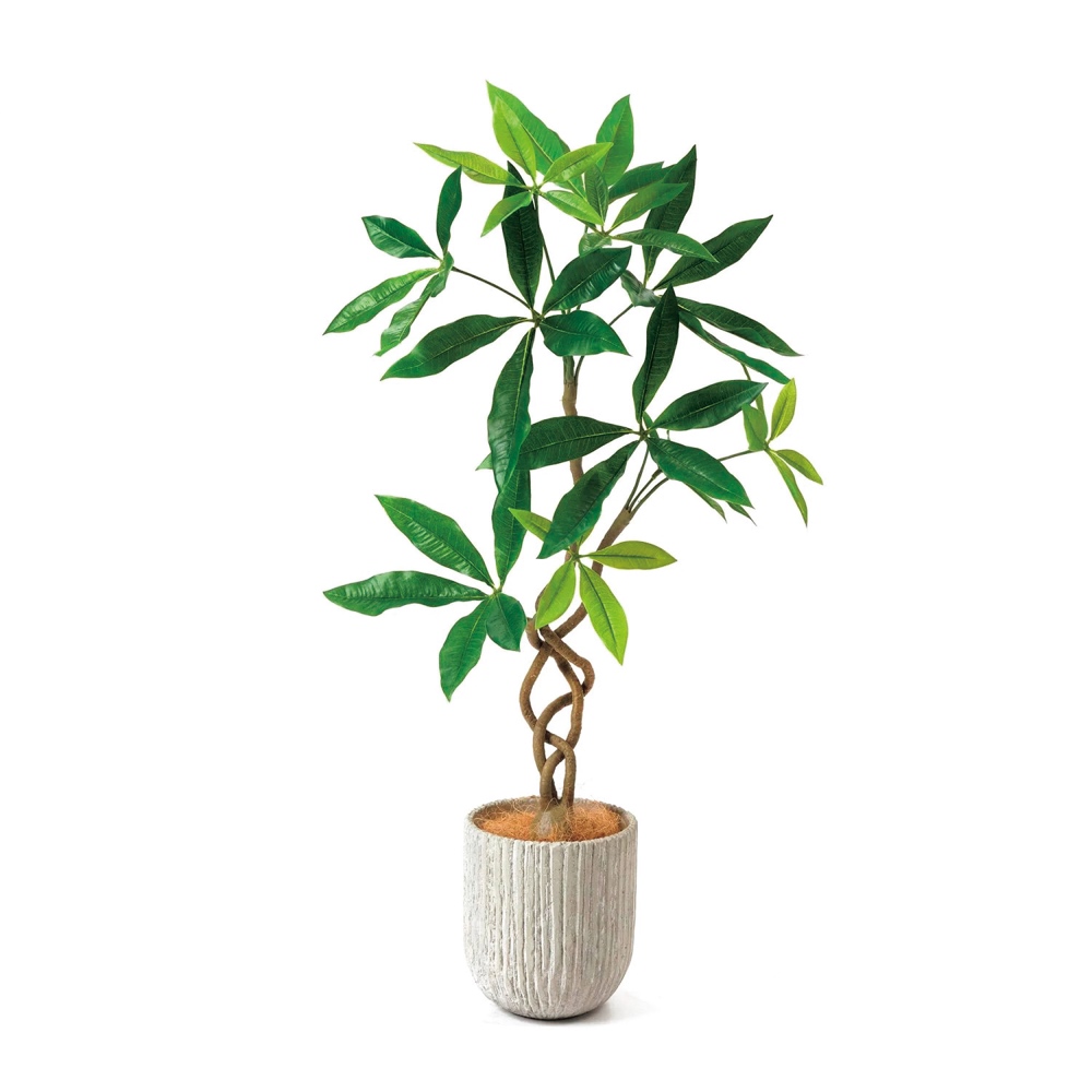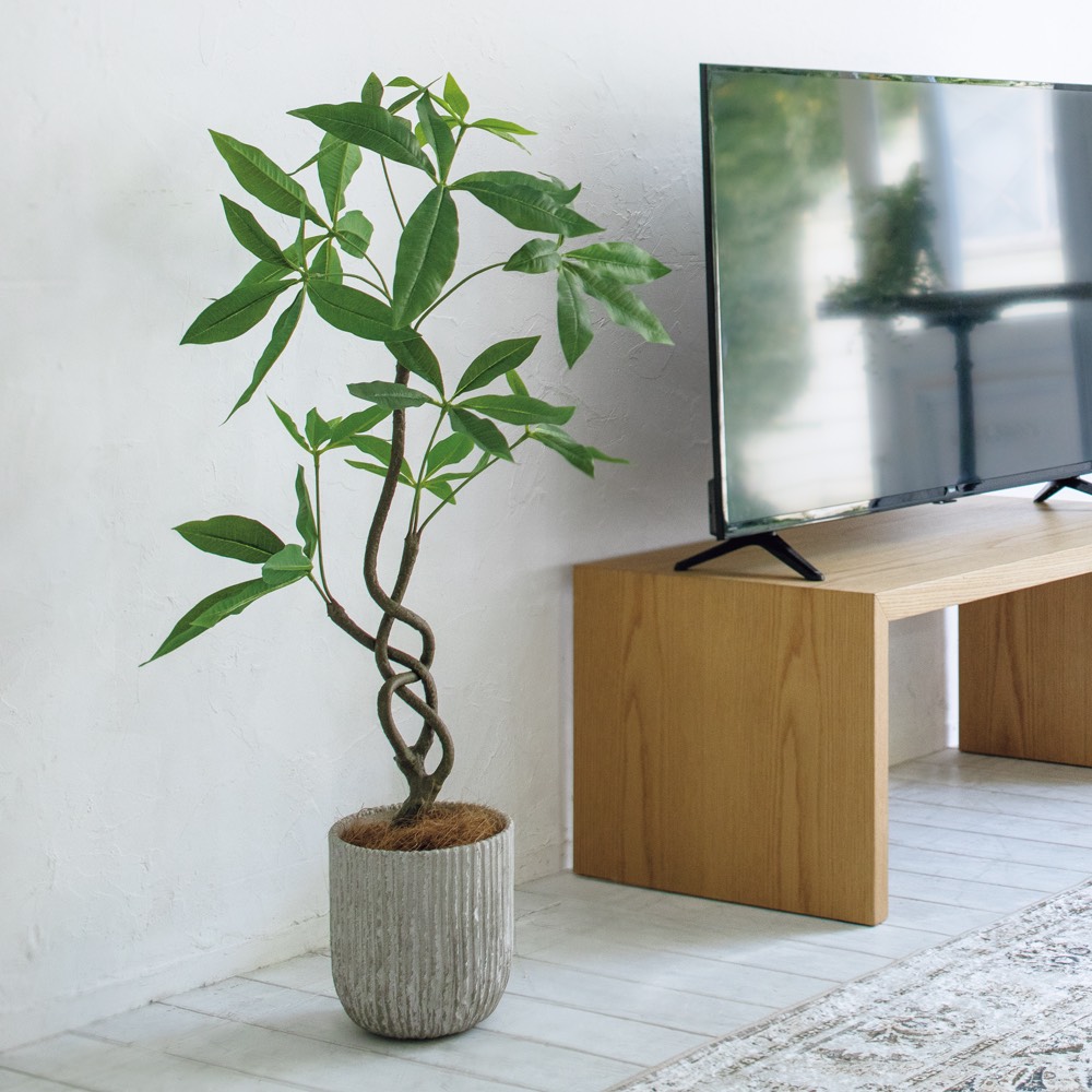 ユニークな幹の編み込みはパキラならでは。デスク後ろに置いてテレワークの画面に映り込ませるのもお洒落です。