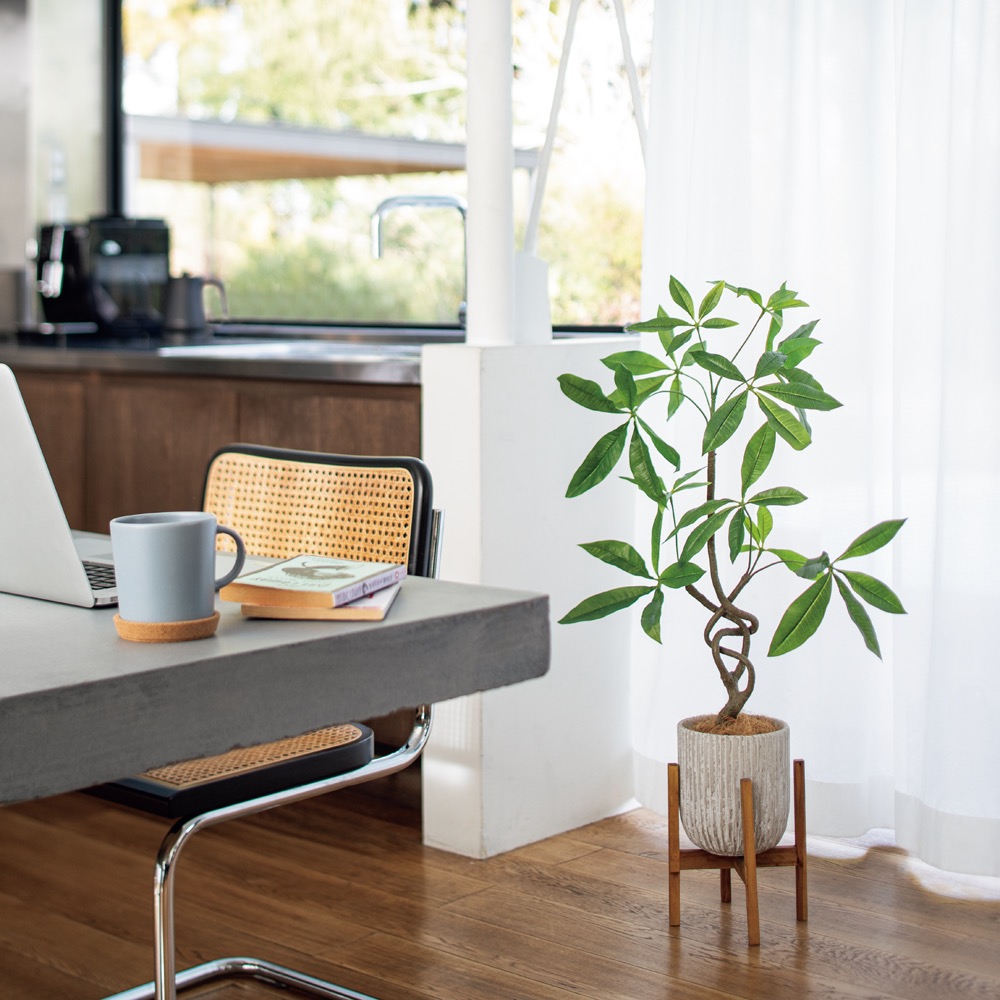 ユニークな幹の編み込みはパキラならでは。デスク後ろに置いてテレワークの画面に映り込ませるのもお洒落です。