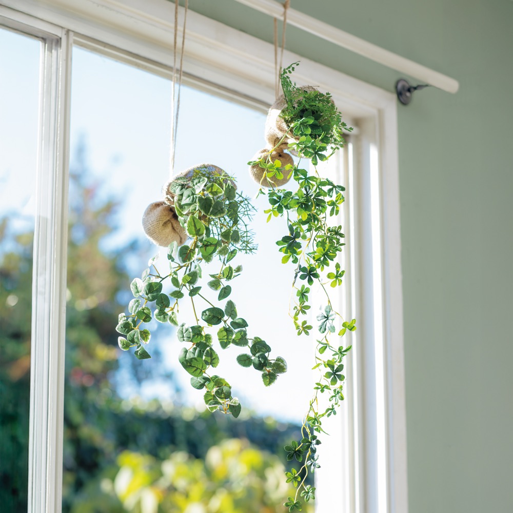 麻袋入りのエコストーンがお部屋のニオイを吸収し、湿度も調節。手を広げたような葉のシュガーバインや白い縁取りの丸い葉のプミラの、可愛らしいアレンジが素敵です。