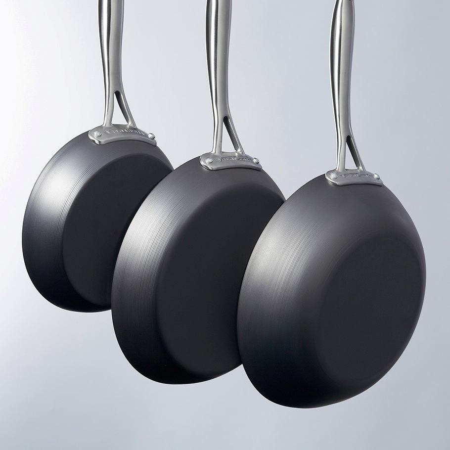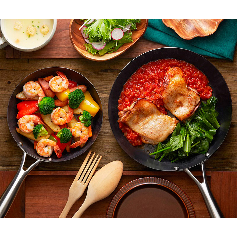 ガスはもちろん、200VのIHクッキングヒーターなどの熱源にも対応。コーティングフライパンとは違って性能が劣化したり剥がれることがなく、金属製のキッチンツールやヘラの使用も可能です。幅広いサイズ展開