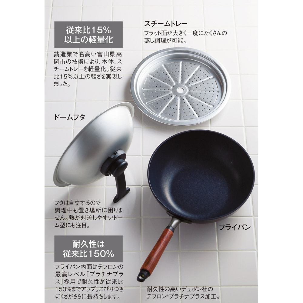 ■本体…アルミニウム合金(内面…テフロンプラチナプラス加工) 取っ手…天然木 スチームトレー・フタ…アルミニウム合金