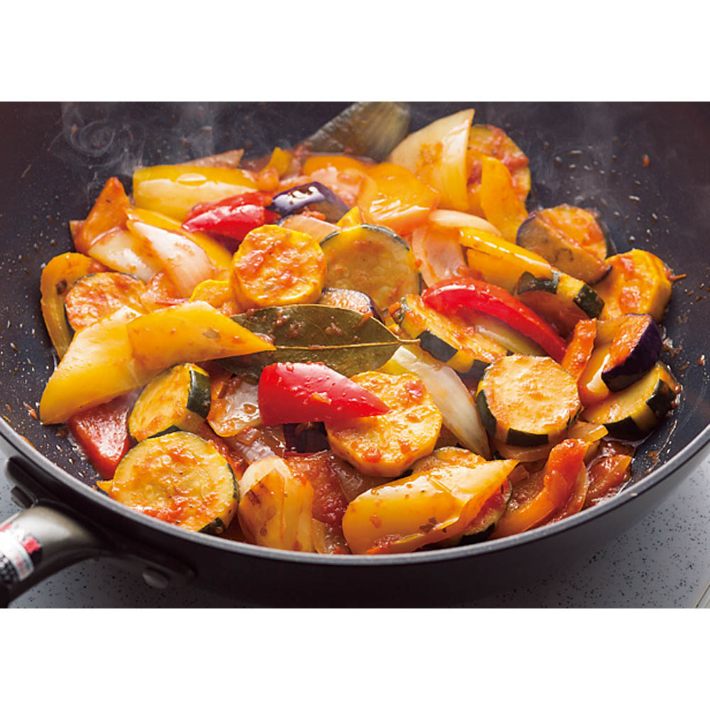 ラタトゥイユ フライパン本体に厚みがあり、フタの密閉度が高いからこそできる無水煮。うまみも栄養も逃がしません。