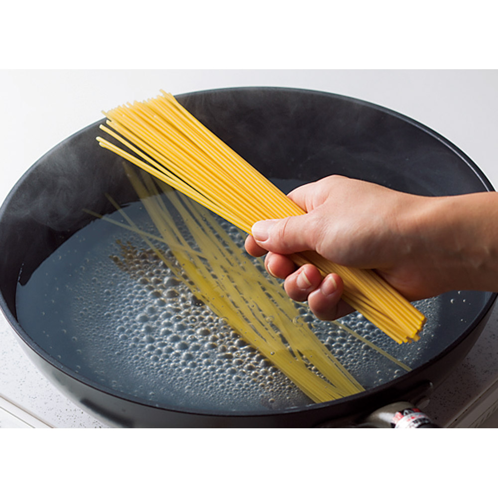 パスタ スパゲッティはそのまま横に入れてゆでられます。(直径28cmのみ)