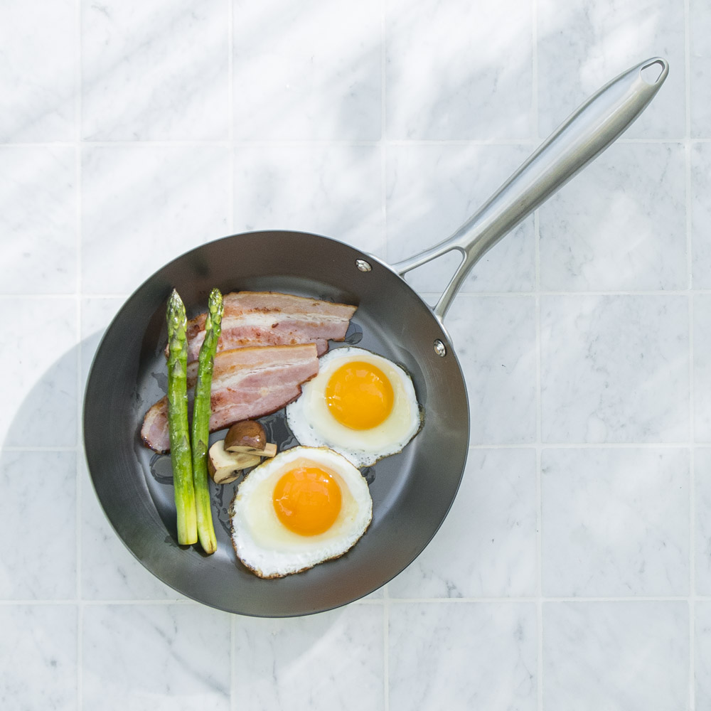 1人~2人までのちょっとした一品料理に最適なサイズで、目玉焼き2つに、横でベーコンや野菜が焼けるサイズ感です。大きすぎず小さすぎない扱いやすいサイズ感が魅力です。●26cm