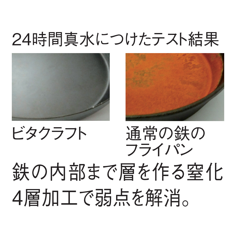 料理が美味しく仕上がる鉄フライパンの魅力をそのままに、鉄の弱点「錆びやすさ」をクリアしたのが、ビタクラフト独自の「窒化4層加工」。錆びが大敵の船舶や航空機に使われる加工技術を応用し、鉄の内部に窒素を浸透させ表面強度を高めることで、錆びにくい強靱なフライパンを完成させました。窒化加工によってできた表面の凹凸が油の吸収性を高め、使えば使うほど油がなじみ、より使いやすいフライパンに育っていきます。焼き物はきれいな焼き色に、炒め物はシャキッとした仕上がりに。Made in Japan 品質