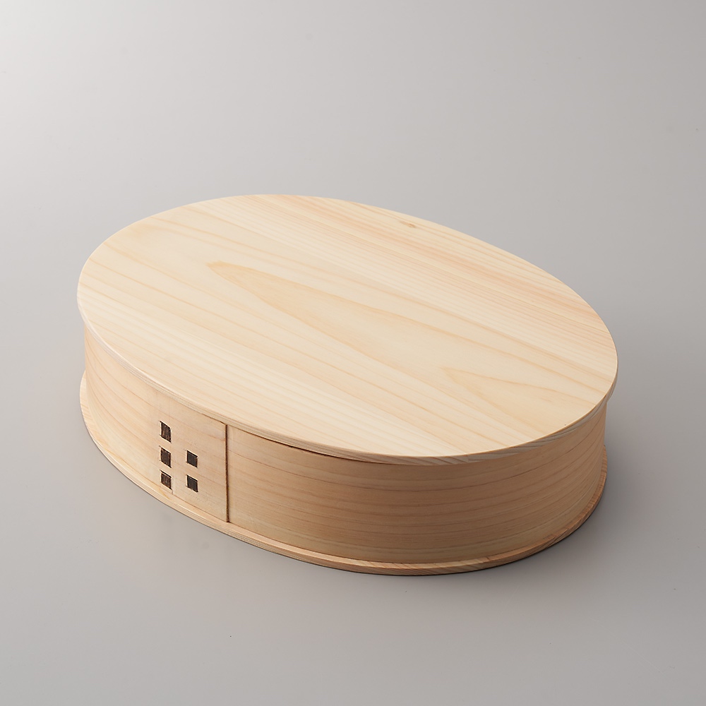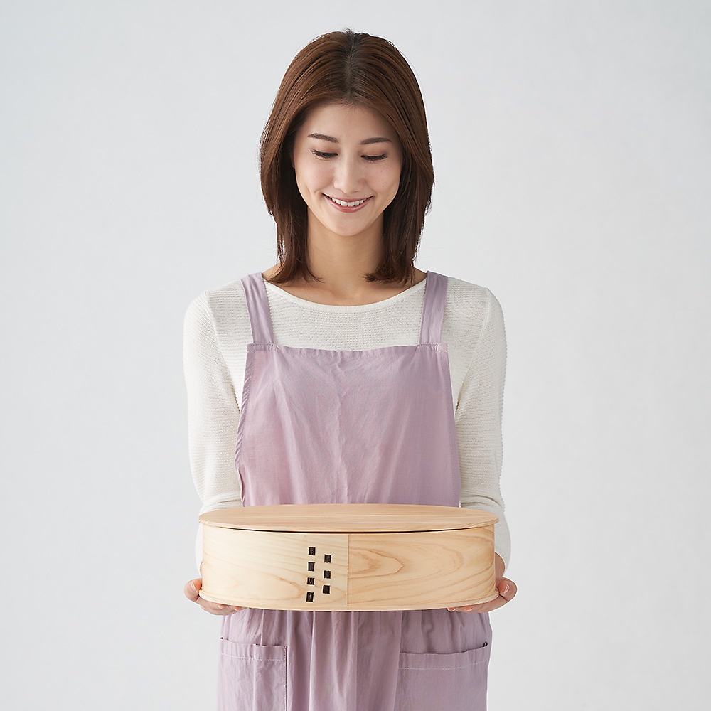 内側と蓋の裏には、食品安全法をクリアしたウレタン塗装を施しているため、油や水にも強く、長く美しい状態を保つことができます。この塗装により、汚れやカビの心配が少なく、素麺など水を張っての使用も可能です(使用時間は1時間を目途に)。無塗装のものに比べて調湿作用は劣るものの、お手入れが簡単で、サンドイッチや油分の多い食材も気軽に楽しむことができます。フタ付きの便利さで多用途に活躍