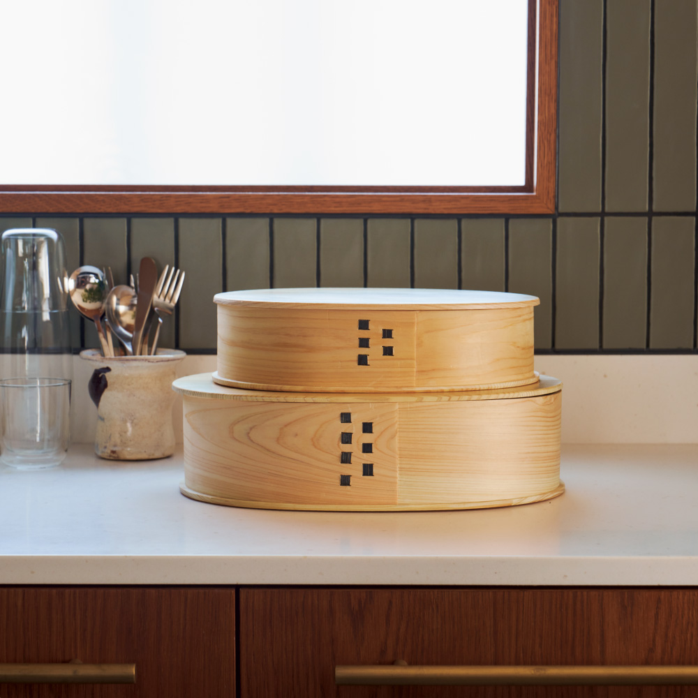和歌山県は、古くから林業で栄える豊かな森林地帯として知られ、「紀州・木の国」とも呼ばれてきました。この地の伝統と技術を結集して作られたのが、紀州わっぱの飯台です。良質な和歌山県産の木材を贅沢に使用し、底と蓋は紀州ヒノキを2層に、わっぱ部分は3層に仕上げています。さらに、留め部分には紀州黒竹を採用しており、その細かなディテールが美しさと強さを兼ね備えています。ウレタン塗装で、長く美しく