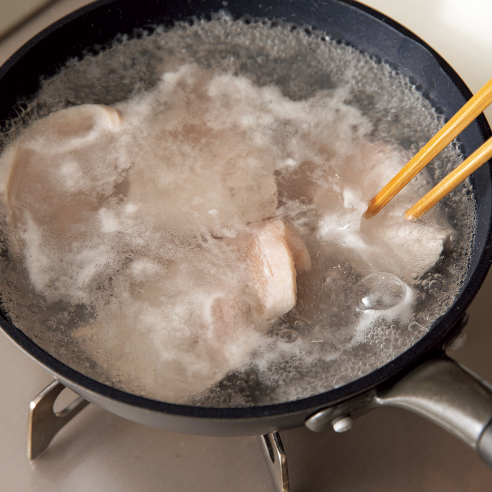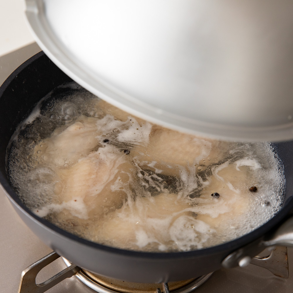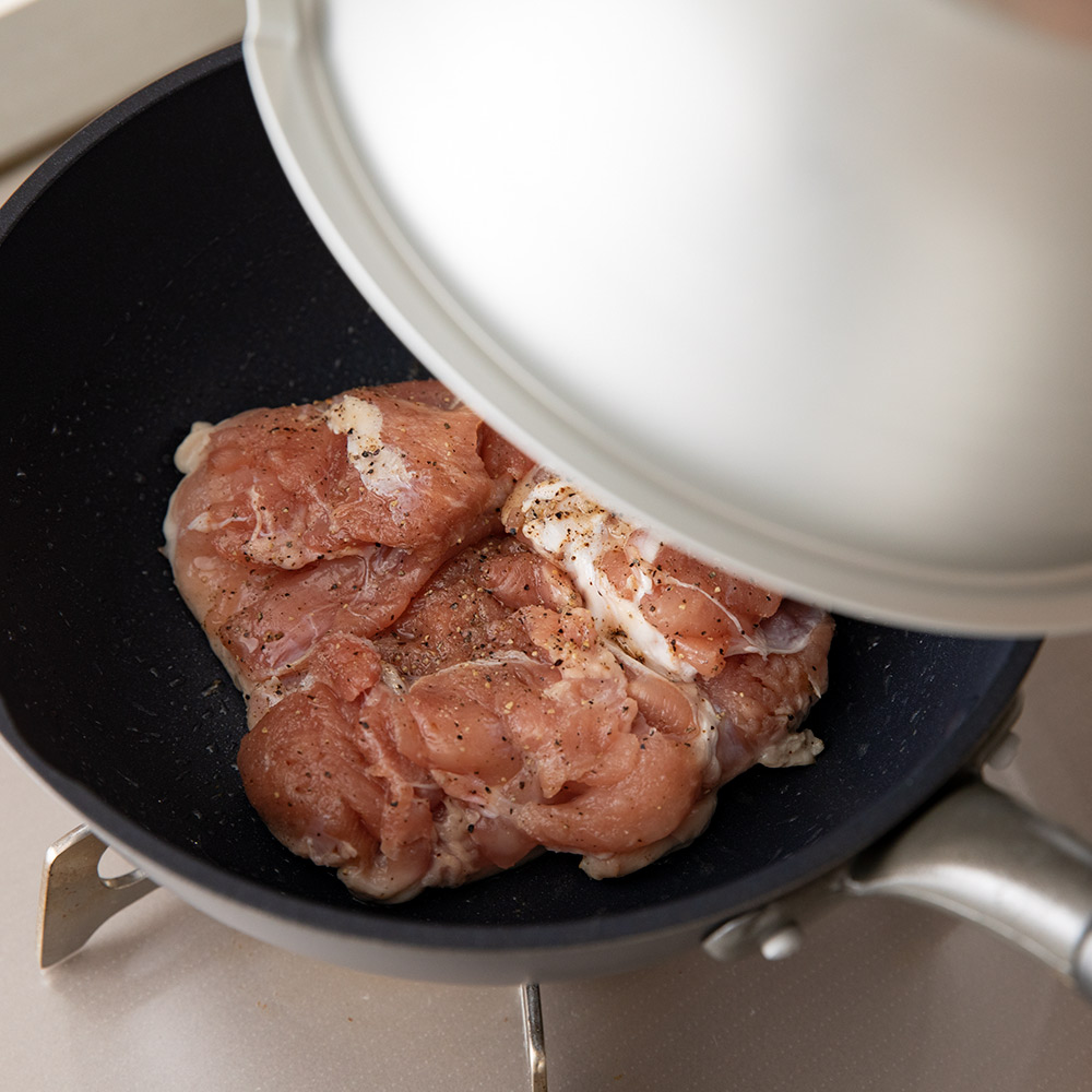 鶏肉も蒸し焼きのようにするとプルップルな仕上がりに。ドーム型の蓋がポイントです。
