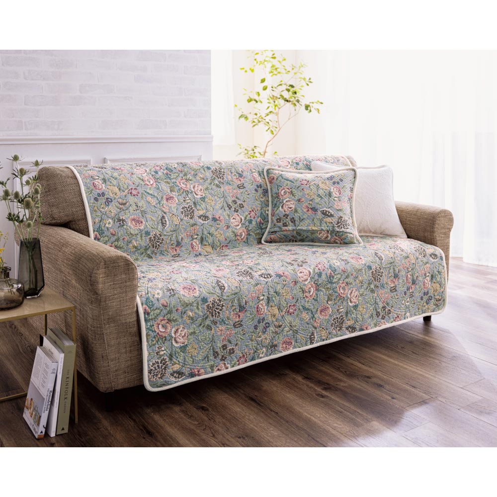表面はこれからの肌寒い季節にうれしいマイクロファイバーの起毛素材、メダリオン柄が繊細に浮かび上がるエレガントなキルトデザインです。裏面は綿100%のサラッと快適な生地に可愛い花柄をプリントしました。季節や気分に合わせて両面を使いわけできるリバーシブル仕様のソファカバー。汚れやすいソファの背や座面を、中わた入りでふっくらとやさしくカバー。ベイシックなソファも1枚かけるだけで気軽にイメージチェンジ。甘さを抑えたグレイッシュトーンが、穏やかで落ち着いた雰囲気の大人のエレガンスを演出します。同シリーズのクッションカバーを使った、トータルコーディネートもおすすめ。