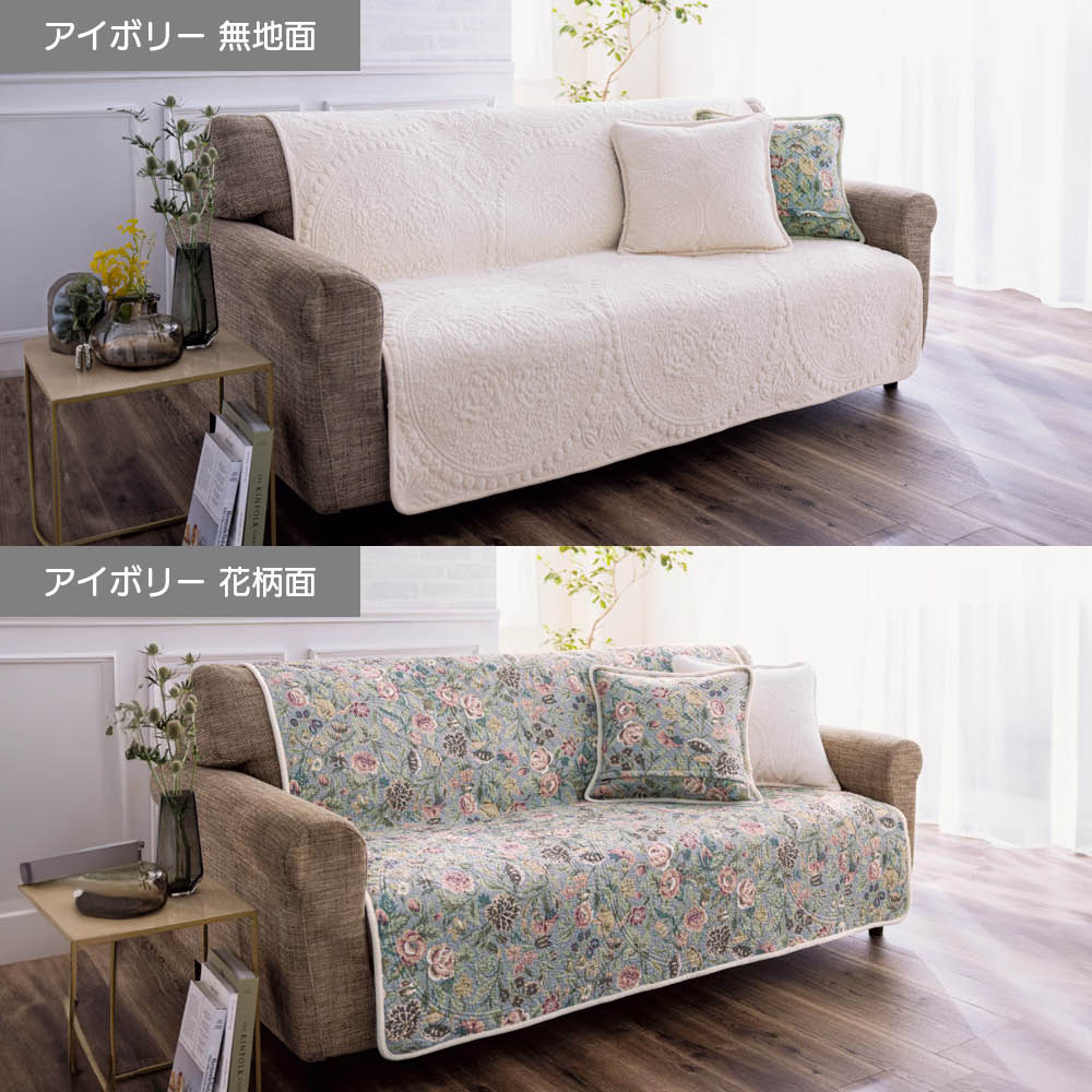 表面はこれからの肌寒い季節にうれしいマイクロファイバーの起毛素材、メダリオン柄が繊細に浮かび上がるエレガントなキルトデザインです。裏面は綿100%のサラッと快適な生地に可愛い花柄をプリントしました。季節や気分に合わせて両面を使いわけできるリバーシブル仕様のソファカバー。汚れやすいソファの背や座面を、中わた入りでふっくらとやさしくカバー。ベイシックなソファも1枚かけるだけで気軽にイメージチェンジ。甘さを抑えたグレイッシュトーンが、穏やかで落ち着いた雰囲気の大人のエレガンスを演出します。同シリーズのクッションカバーを使った、トータルコーディネートもおすすめ。