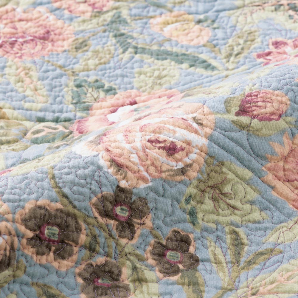 表の起毛面は、ソフトでなめらかな肌ざわりのマイクロファイバー。繊細に浮かび上がるメダリオンのキルトデザインがエレガント。中綿入りで、メダリオン柄にそったキルティングでふんわりと仕上げました。【ポイント2】柄面はサラッとした綿100%の花柄