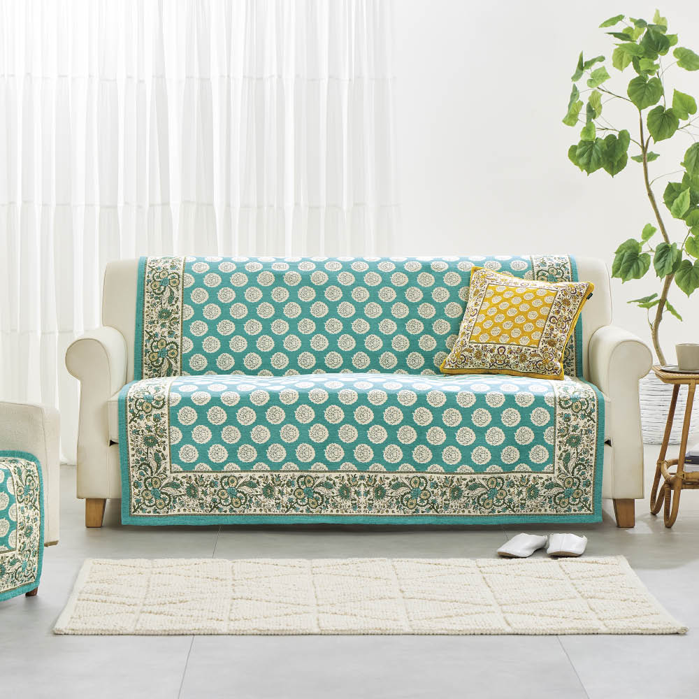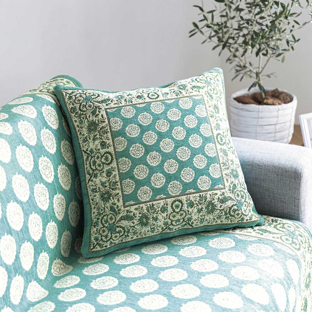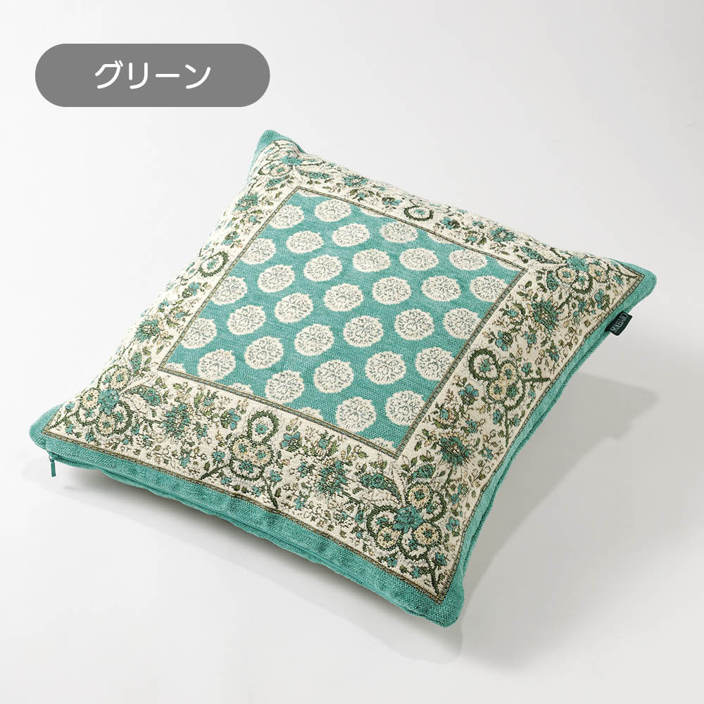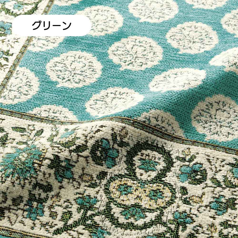 同シリーズのソファ中掛けと合わせれば、インテリアにまとまりが生まれ、より洗練された雰囲気に。草花柄のジャカード織が彩りを添え、空間全体を引き立てます。(写真は(ア)グリーン)