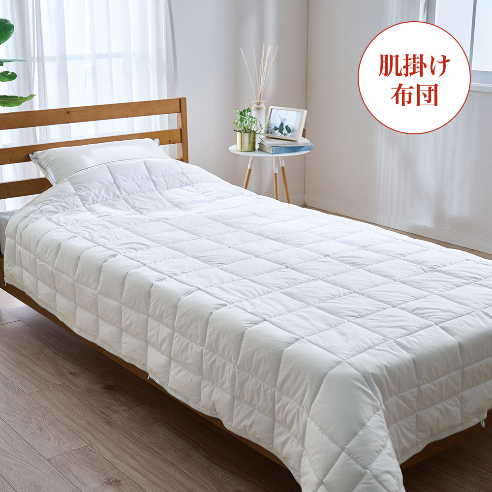 「肌掛け」中わた重量0.4kg(シングルサイズ)・・・細かいキルトパターンでさらっとした使い心地です。汗や蒸れが気になる夏の暑い季節を快適にします。冷房での冷えが気になる方にもぴったりです。