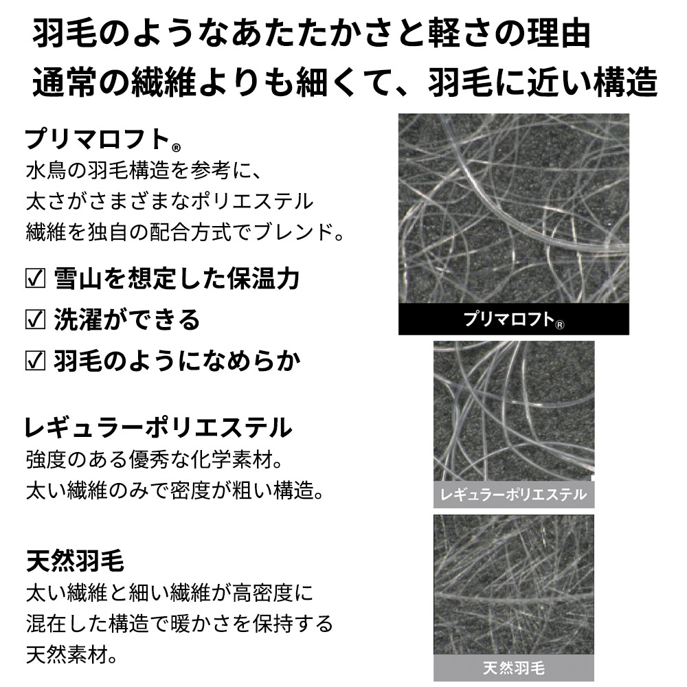 暖気をたっぷり溜め込む水鳥の羽毛構造をヒントに開発された中わた・プリマロフト(R)。高級羽毛のように軽く暖かくムレにくいのに、洗濯機で丸洗いできて衛生的にお使いいただけます。羽毛のニオイやホコリが気になる・お手入れが面倒という方にもおすすめです。【ポイント】