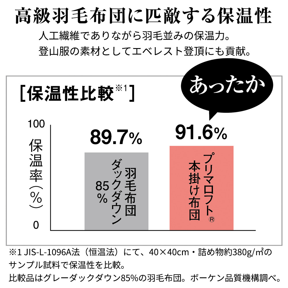 人工繊維でありながら羽毛並みの保温力を持つプリマロフト(R)。登山服の素材として、エベレスト登頂にも貢献しています。【ポイント2】軽くやわらかく暖かい掛け心地