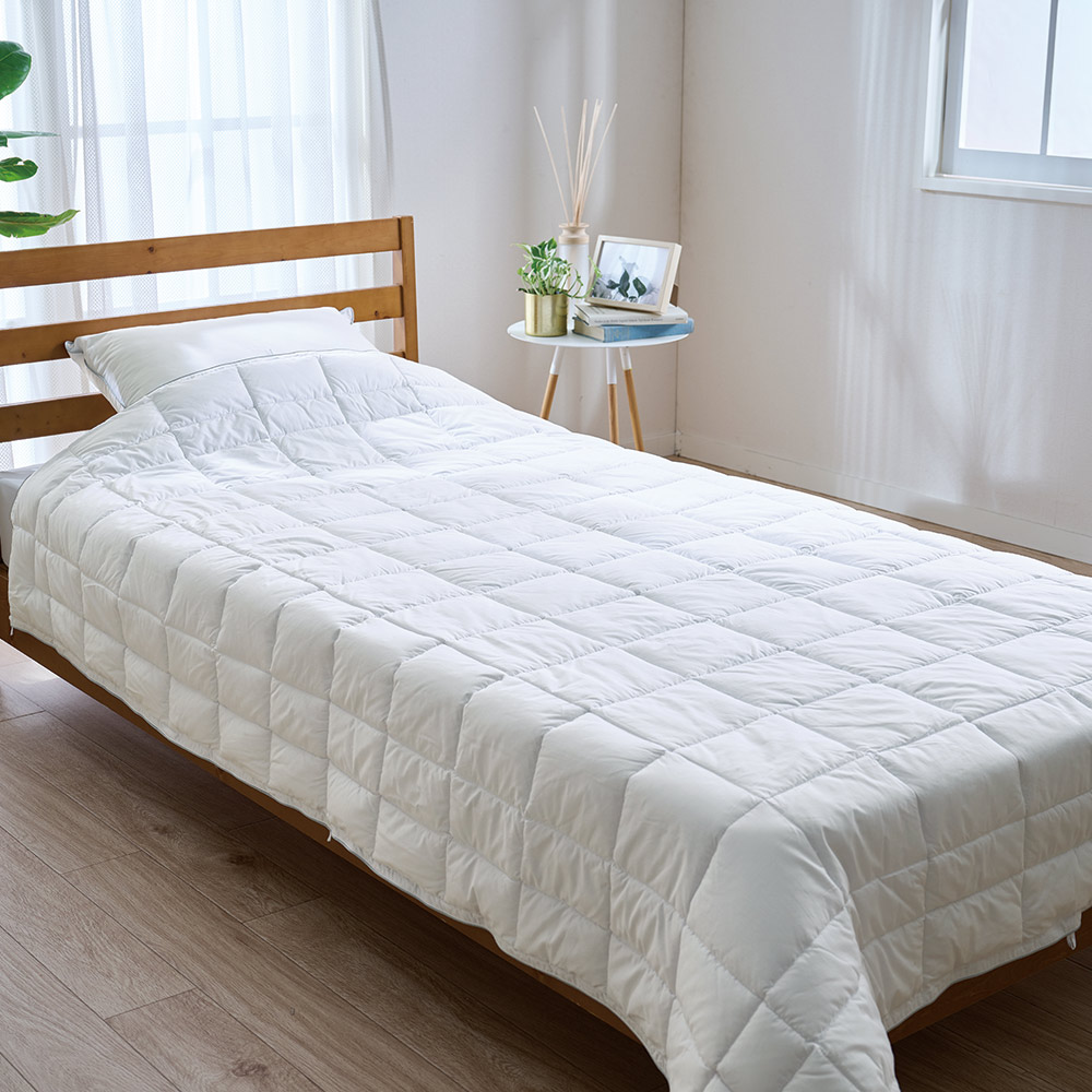 「肌掛け」中わた重量0.4kg(シングルサイズ)・・・細かいキルトパターンでさらっとした使い心地です。汗や蒸れが気になる夏の暑い季節を快適にします。冷房での冷えが気になる方にもぴったりです。