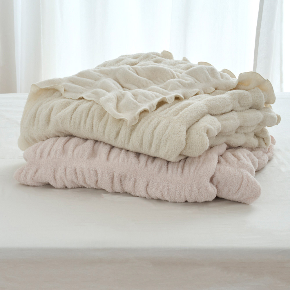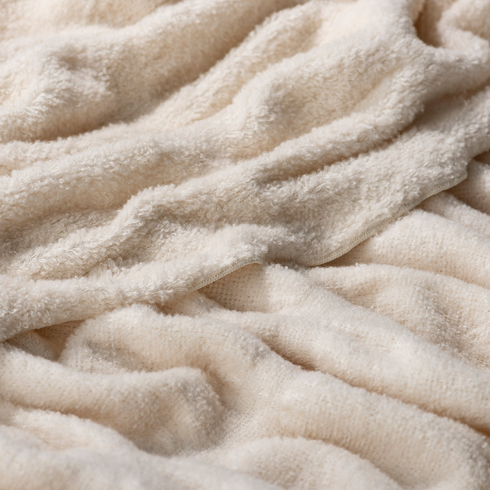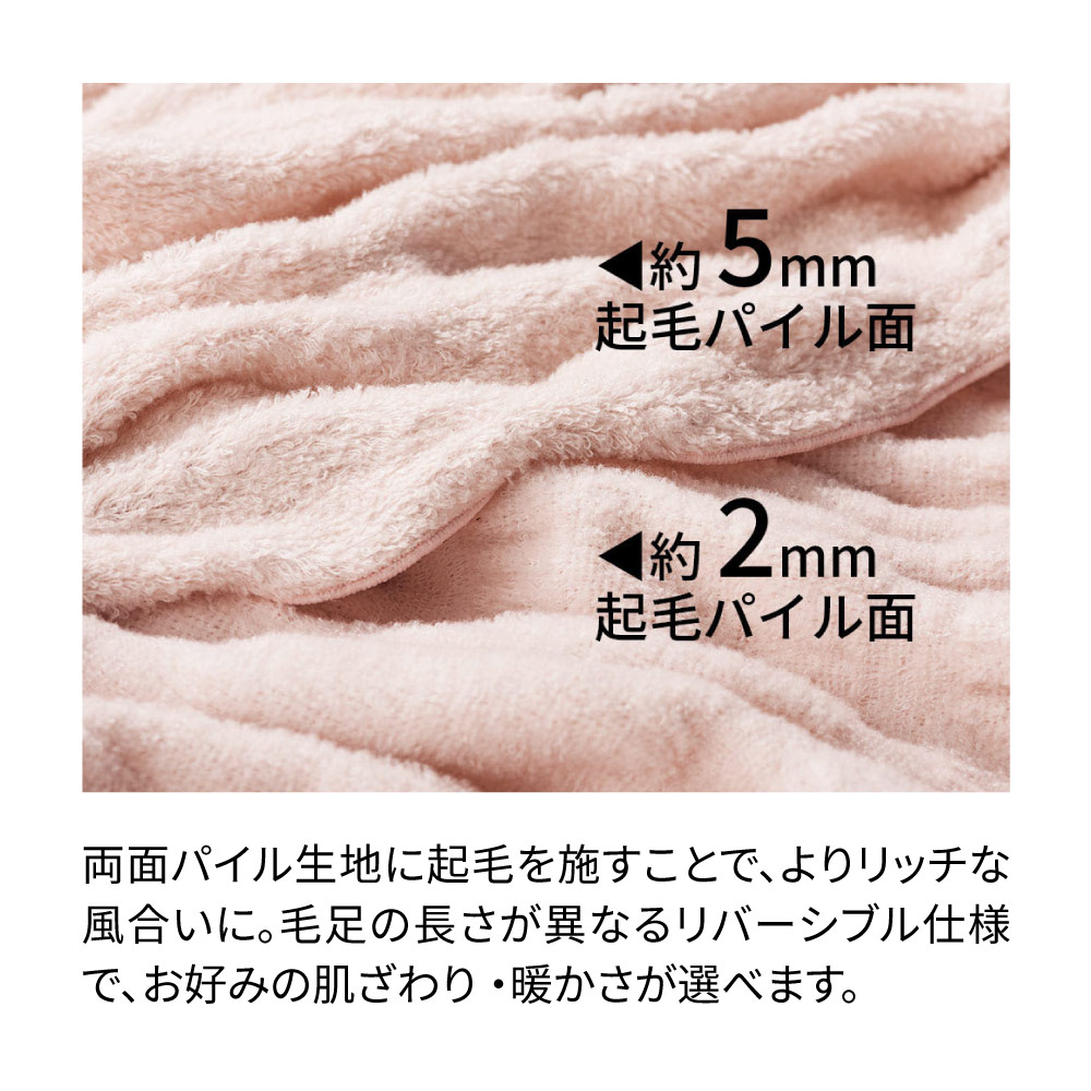 両面パイル生地に起毛を施すことで、一段とリッチでふわふわの風合いに!表裏で毛足の長さが異なるリバーシブルなので、季節やお好みに合わせてお楽しみいただけます。空気をたっぷり含んだコットンの優しい肌ざわりで、軽くムレにくく暖かな掛け心地です。