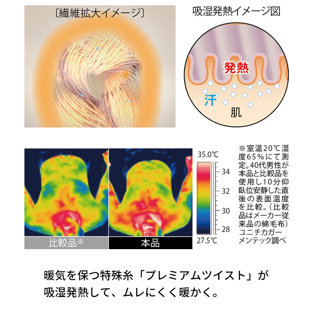 “暖かい空気をたっぷり保つ”特殊糸「プレミアムツイスト」が吸湿発熱して、寝具内をムレにくく暖かく