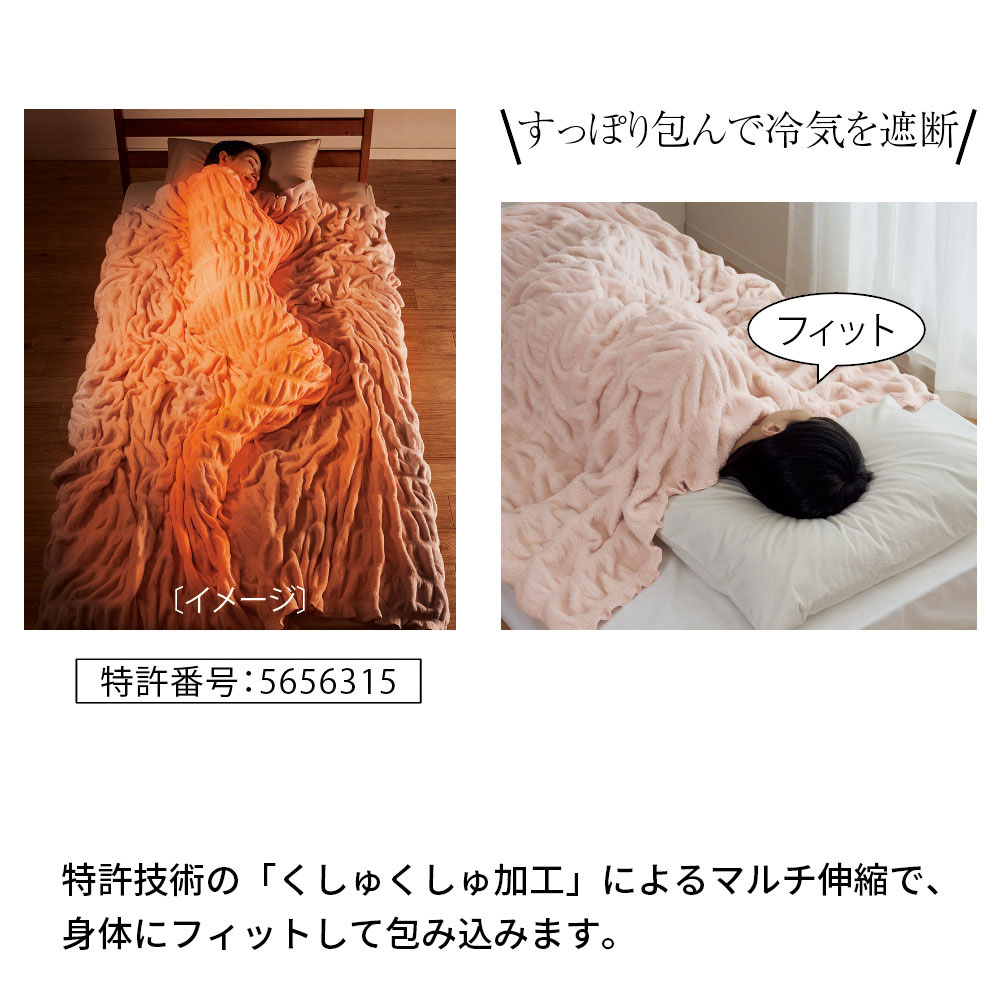 丁寧に起毛したニット生地をくしゅくしゅに加工。ふんわりやわらかく伸縮性があり、身体をすっぽり包み込んで冷気を遮断します。寝返りを打ってもずれにくく、暖かく快適です。
