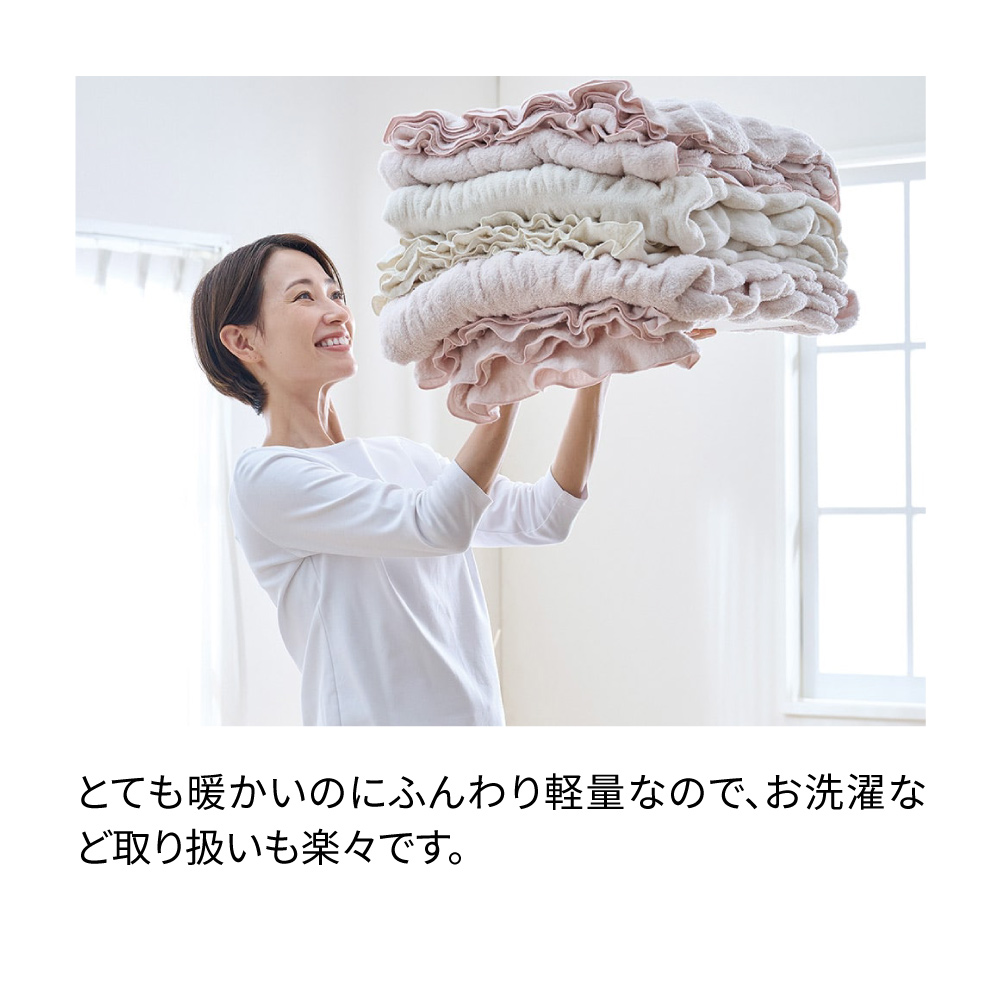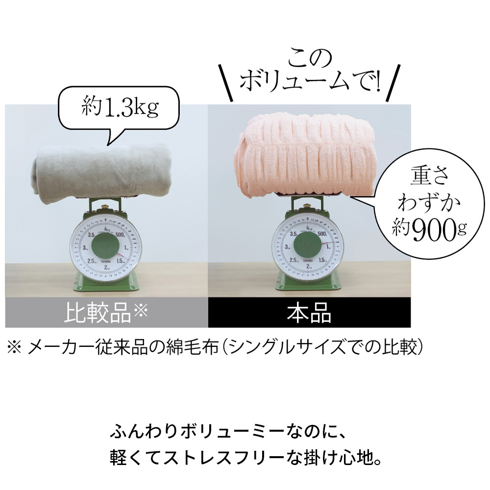 このボリュームで、重さわずか約900g(シングルサイズ)と軽量。メーカー従来品の綿毛布と比較したところ、本品はふっくらボリューミーでありながら驚きの軽さ!空気をたっぷり含んでいるからとても暖かく軽量で、ストレスフリーな掛け心地です。