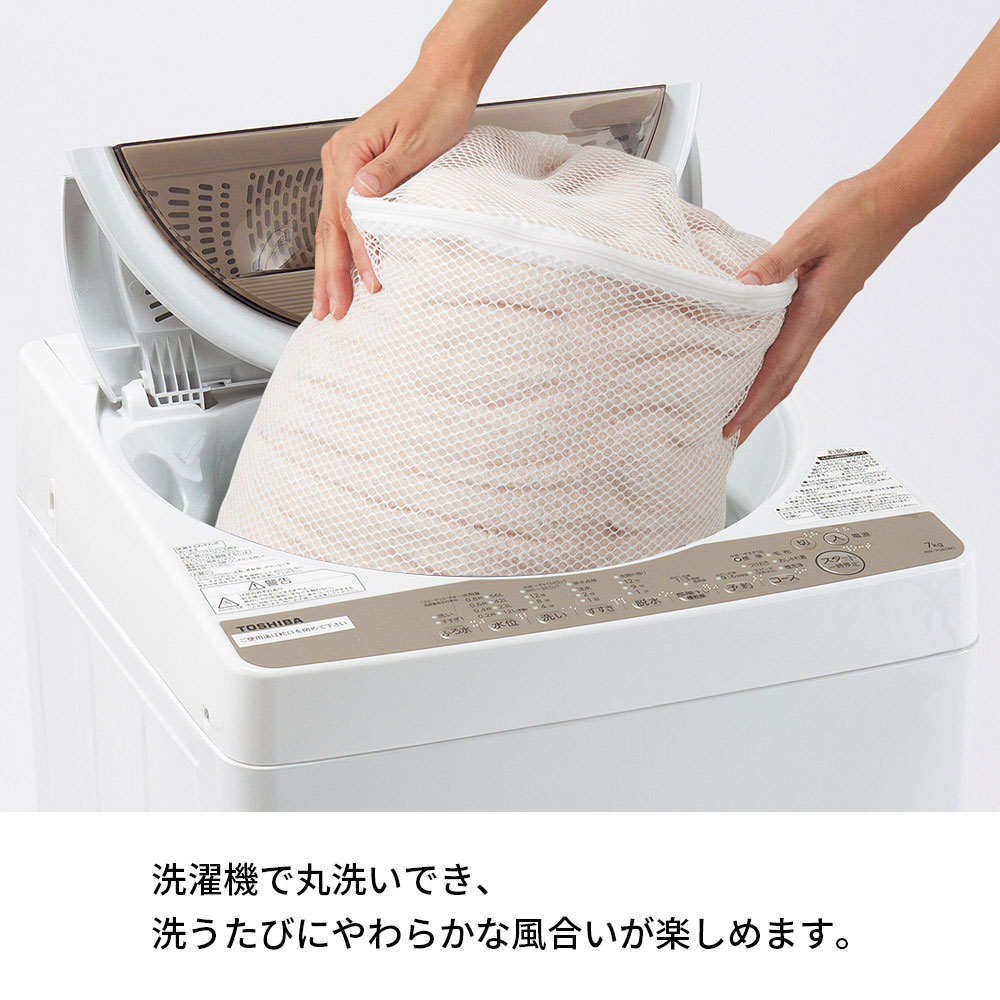 ご自宅の洗濯機で丸洗いでき(ネット使用)、清潔に気持ちよくお使いいただけます。洗うたびふっくらやわらかな風合いが楽しめます。