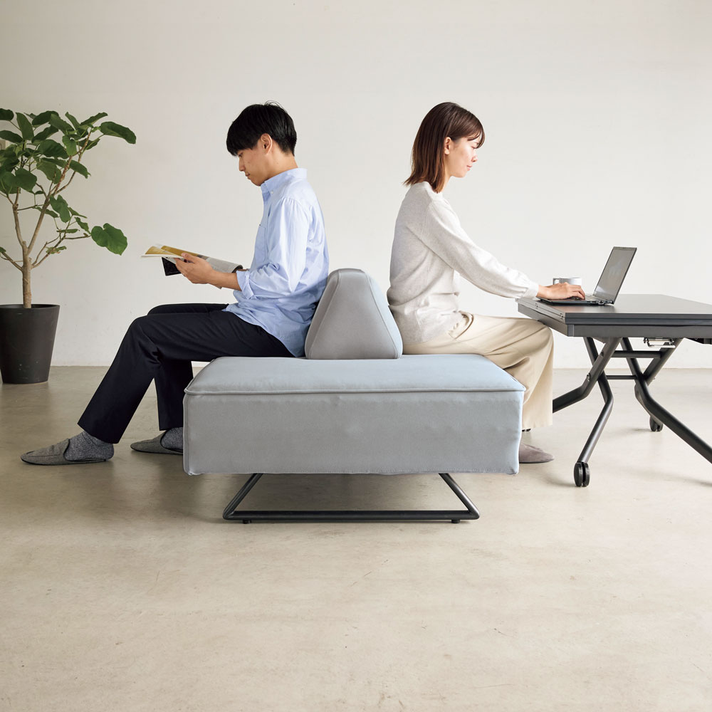足を伸ばしてくつろぐ、ちょっと腰掛ける、あぐらをかいて座る、寝ころぶ…。いろいろなシーンにあわせてクッションを好きに配置できる、自由度の高いアイランドソファ。お部屋のインテリアに合わせて選べる2色展開。レザーのような風合いのファブリックは高級感が漂います。