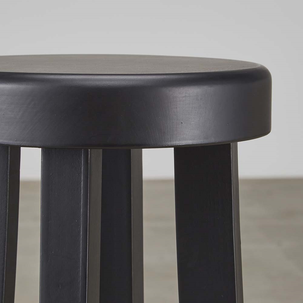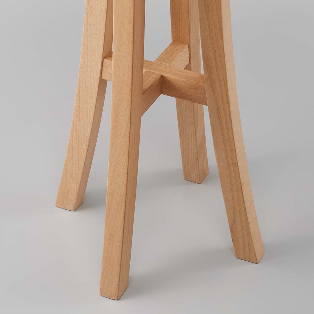 岡山県の山間の納屋で作られたことから名付けられたナヤスツールは、1974年に小松勲氏の手から生み出されました。小松氏が木彫りの備中神楽面の制作の際に作業用の椅子として使ったものです。小学校教員の定年を機に、生来の手先の器用さを活かして、備中神楽面という難しい木彫り面の制作を26年に渡り続けました。小松氏の作る備中神楽面は、五穀豊穣を祈る神事から生まれたもので、この地方では家内内安全、家運隆盛を願って、伝統的に家の玄関に置かれてきました。ナヤスツールは、20年以上もの間忘れられたまま納屋の二階に置かれていましたが、2020年に神楽面用の材木の中から発見されました。