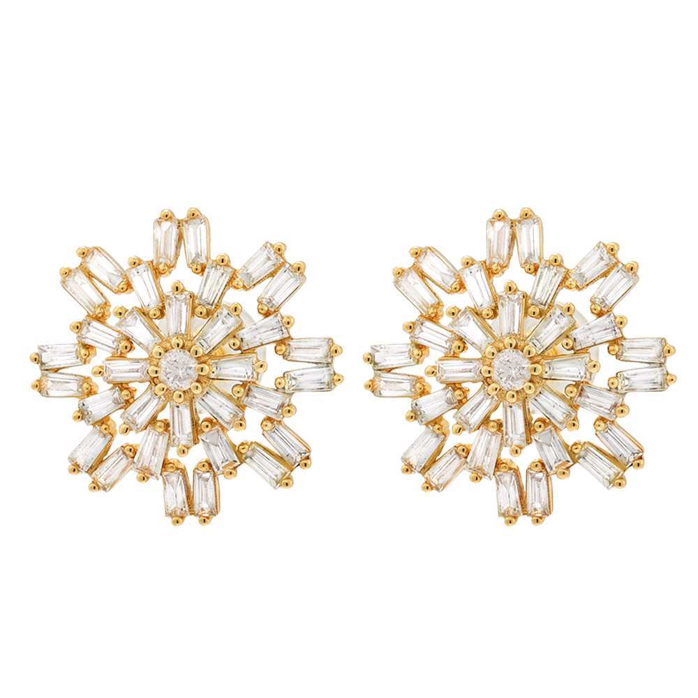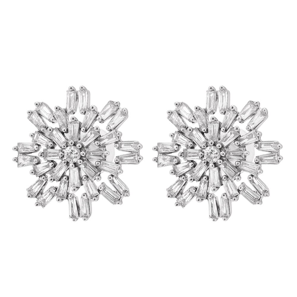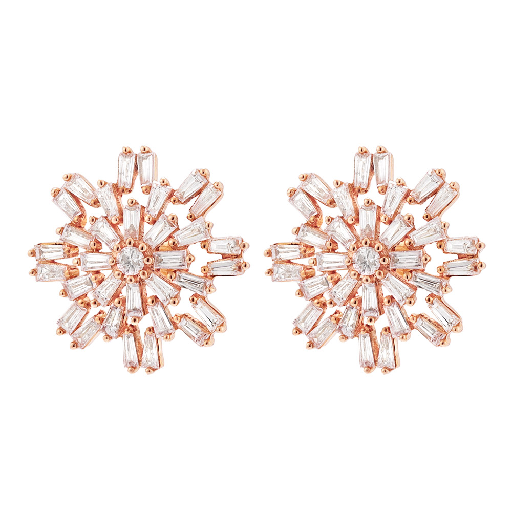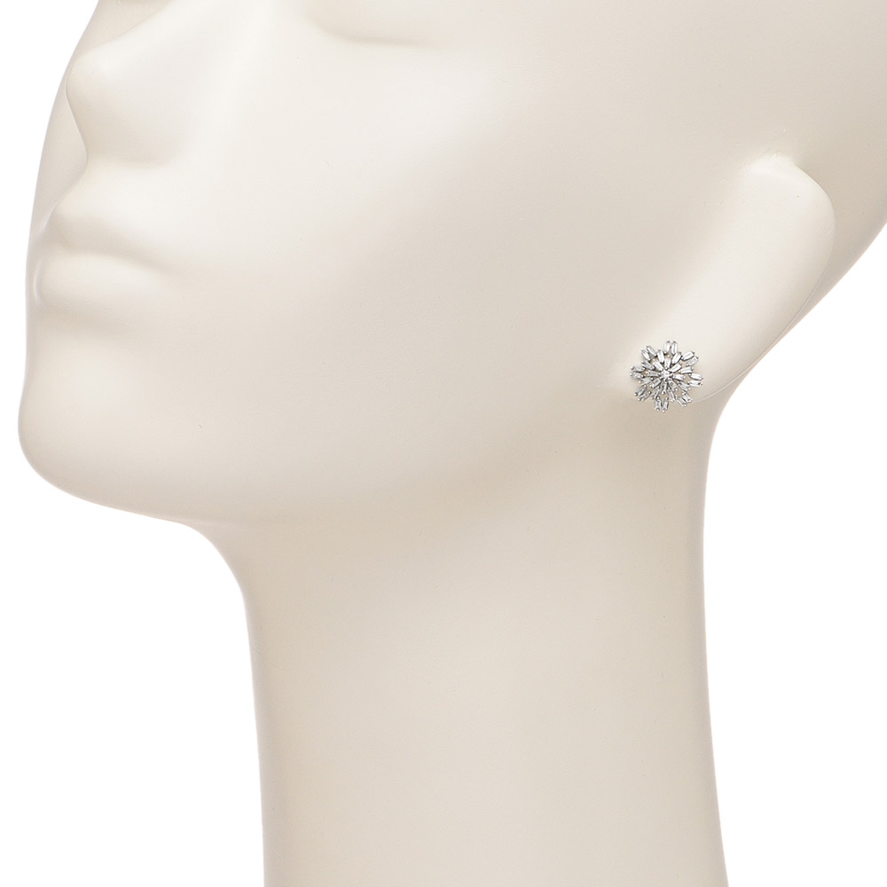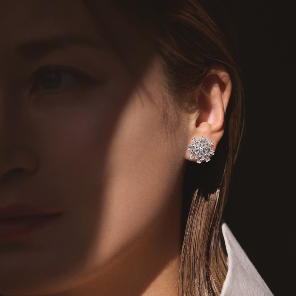 正面からも、横顔も、華やかな輝きで照らしてくれるテーパーカットのダイヤピアス。1ctものダイヤを放射状にあしらい、センターに高さを出しながら配置することで、奥行き感のある光を演出。甘すぎない凛とした煌めきはテーパーカットならでは。