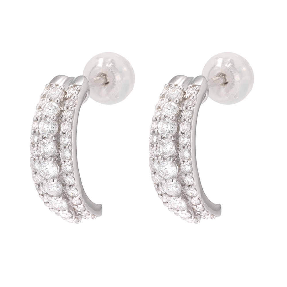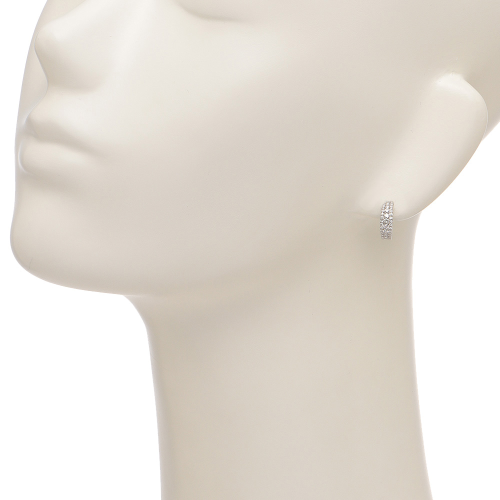 ダイヤの澄みきった光が、面差しを明るく輝かせて。カーブを描くハーフフープに3列に配したダイヤが燦々と輝くピアス。商品画像の説明